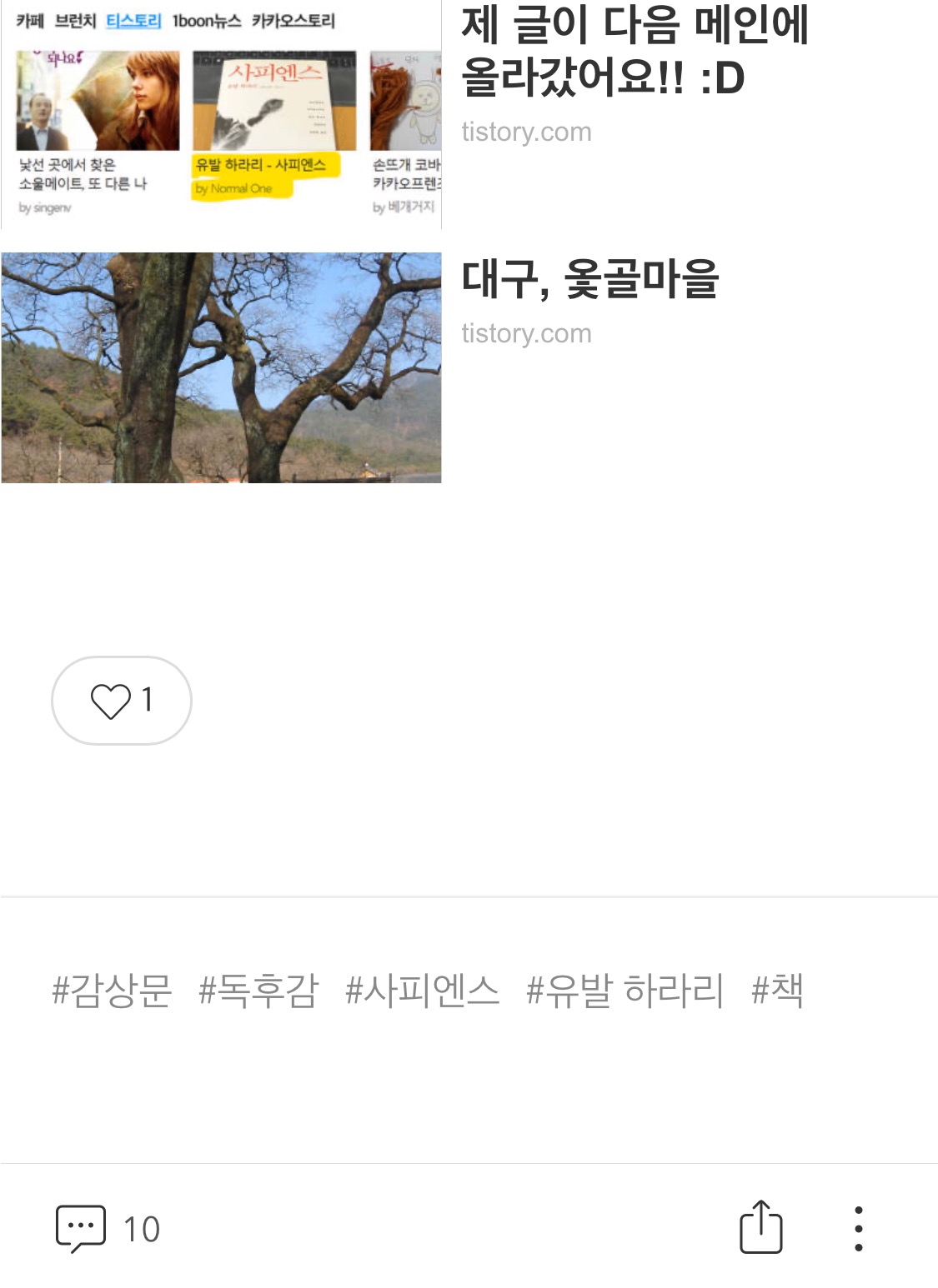 앱에서도 공감버튼이 생겼다. 2020.01.13 16:34 IT/Blog 반응형 앱을 따로 업데이트 한 것도 아닌데 공감버튼이 생겼다.앱 리뉴얼되고 잠깐 보였다가 이내 사라졌었는데이제 다시 보이네.앞으로 공감버튼 누르러 브라우저 안 써도 되겠다.내심 번거로웠는데 잘 됐음.. 공유하기 게시글 관리 Echte Liebe 'IT > Blog' 카테고리의 다른 글 제 글이 다음 메인에 올라갔어요!! :D (0) 2020.01.20 어!? 제 글이 다음 메인에 올라갔어요!! :D (0) 2020.01.14 공감버튼이 살아났다. (14) 2020.01.12 ....많이 놀라셨죠? (6) 2020.01.11 제 글이 다음 메인에 올라갔어요!! :D (0) 2020.01.10 댓글 공유하기 다른 글 댓글 이 글 공유하기 구독하기 구독하기 카카오톡 카카오톡 라인 라인 트위터 트위터 Facebook Facebook 카카오스토리 카카오스토리 밴드 밴드 네이버 블로그 네이버 블로그 Pocket Pocket Evernote Evernote 다른 글 제 글이 다음 메인에 올라갔어요!! :D 제 글이 다음 메인에 올라갔어요!! :D 2020.01.20 어!? 제 글이 다음 메인에 올라갔어요!! :D 어!? 제 글이 다음 메인에 올라갔어요!! :D 2020.01.14 공감버튼이 살아났다. 공감버튼이 살아났다. 2020.01.12 ....많이 놀라셨죠? ....많이 놀라셨죠? 2020.01.11 다른 글 더 둘러보기