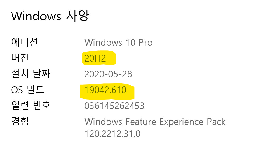 원래 20H2 업데이트 직후 빌드번호는 19042.572인데, 업데이트 후에 추가 누적 업데이트가 있어 모두 끝내니 빌드번호가 19042.610으로 바뀌었다. 그렇게 업데이트 끝!!