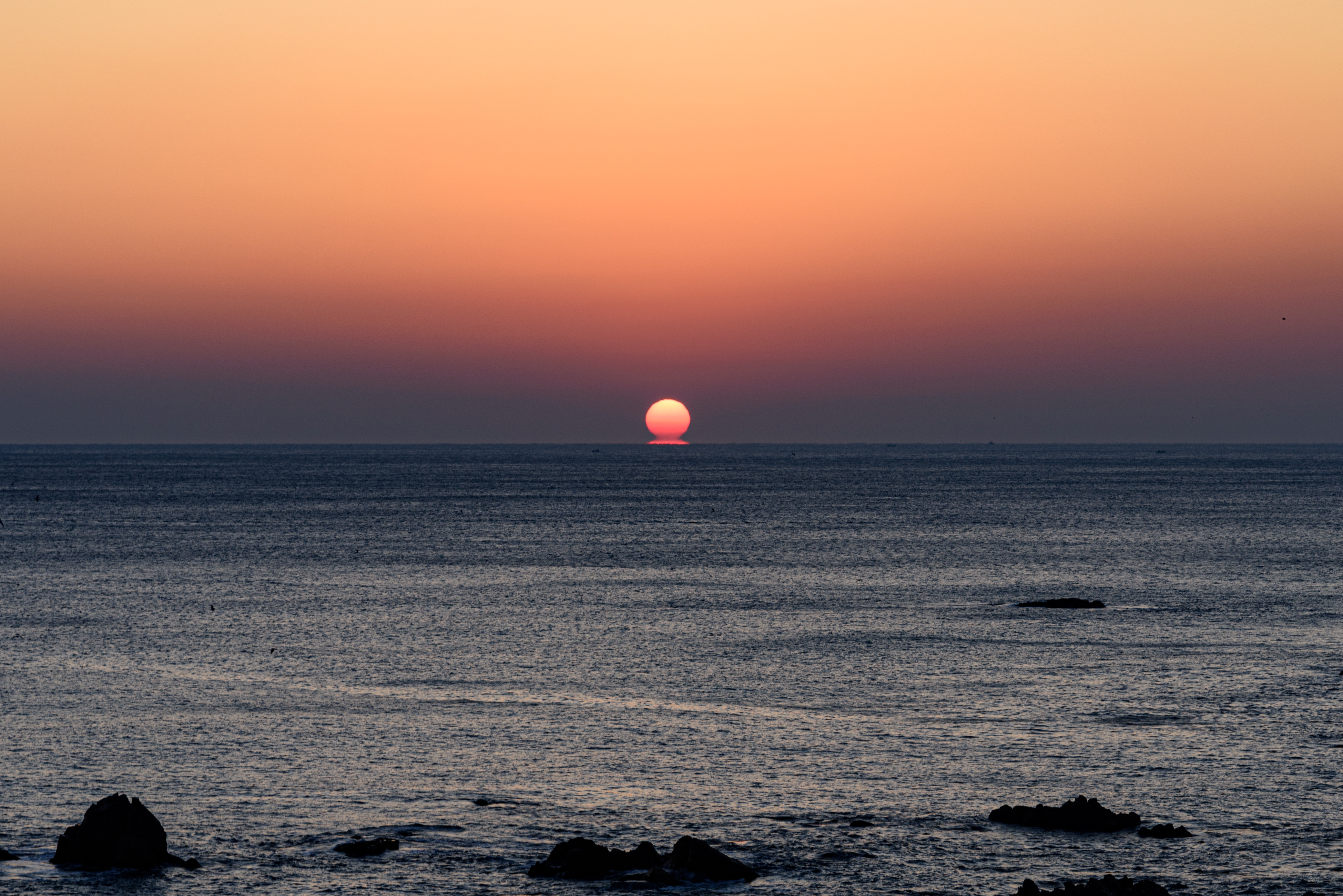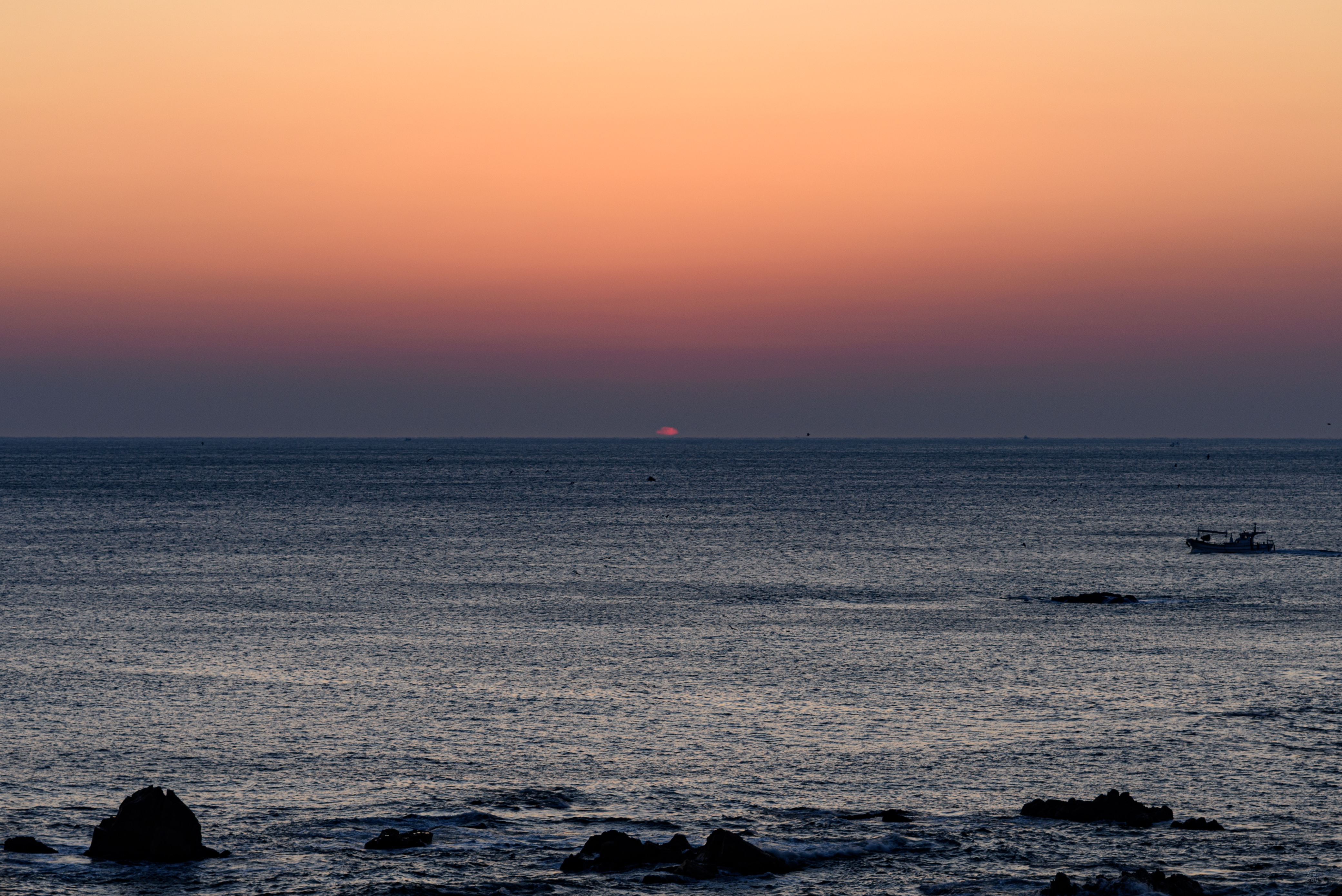 알람이 울리고, 잠시 빈둥대다 이내 몸을 일으켰다. 간단히 잇솔질과 물세수를 한 후, 카메라를 챙겨 낙산사 의상대로 갔다. 다행히 숙소가 낙산사 올라가는 길 입구쪽에 있어 의상대까지 가는 데 그리 오래 걸리지 않았다. 의상대에 도착하니 약 7시 15분 경이었는데, 하늘이 이미 밝았더라. 그래도 한 가지, 오늘 해는 볼 수 있겠구나 싶었다. 비록 해수면 근처에 안개가 끼면 할 말이 없지만, 적어도 푸른 색에서 붉은색까지 깨끗하게 물든 하늘을 보니 날씨는 완-벽했다.