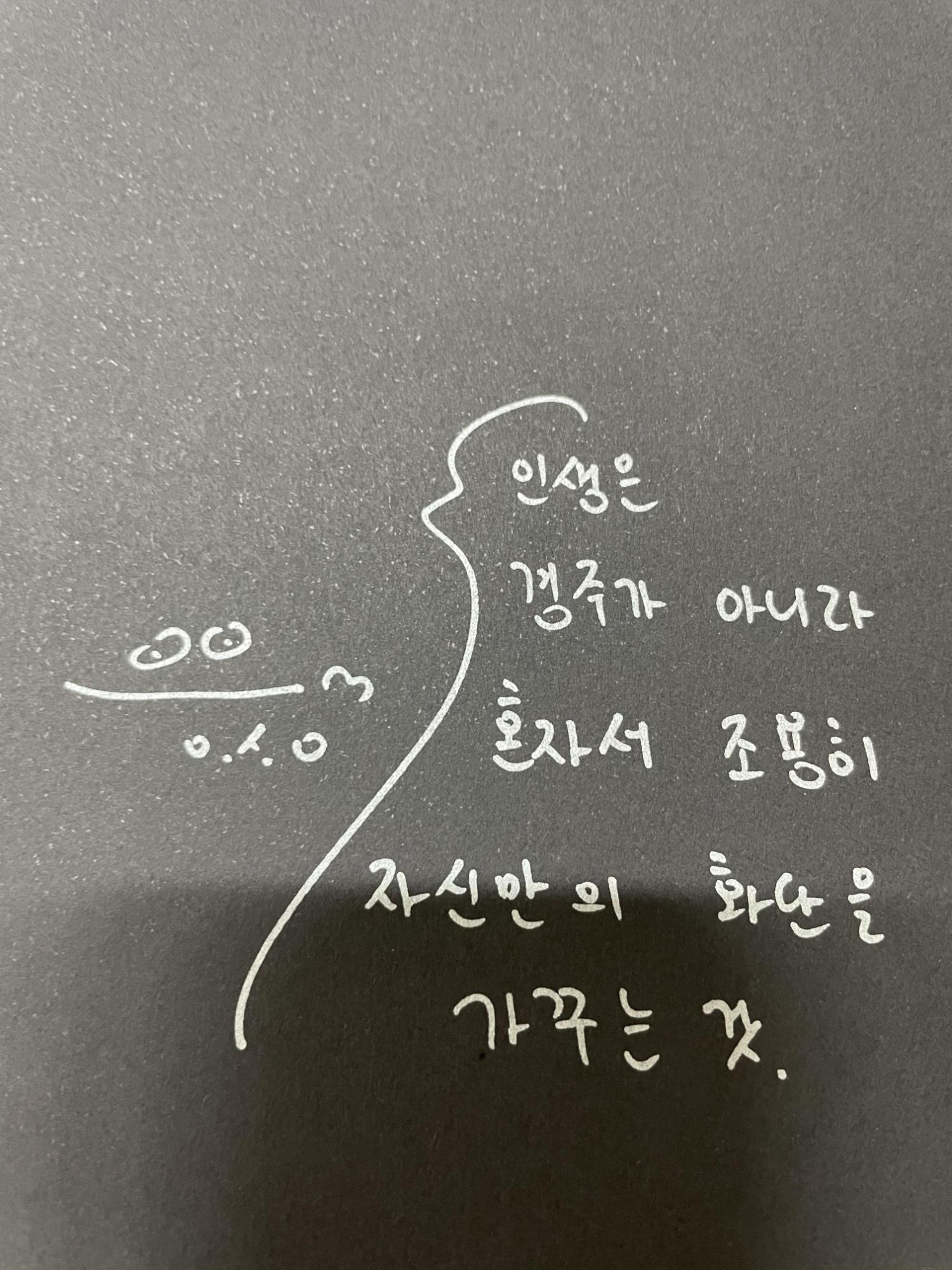 이 분의 책에 왜 이렇게 몰입이 잘 될까 생각해봤는데, 예전엔 '나에게'도 그런 면이 있기에 공감하는 거라 생각했다. 그런데 이젠 '누구든' 속에 그런 모습을 지니고 있으니 공감받는 게 아닐까 싶다. 그리고 엽서가 있었는데, '인생은 경주가 아니라 조용히 자신만의 화단을 가꾸는 것.'이라는 말에 백번 공감했다.