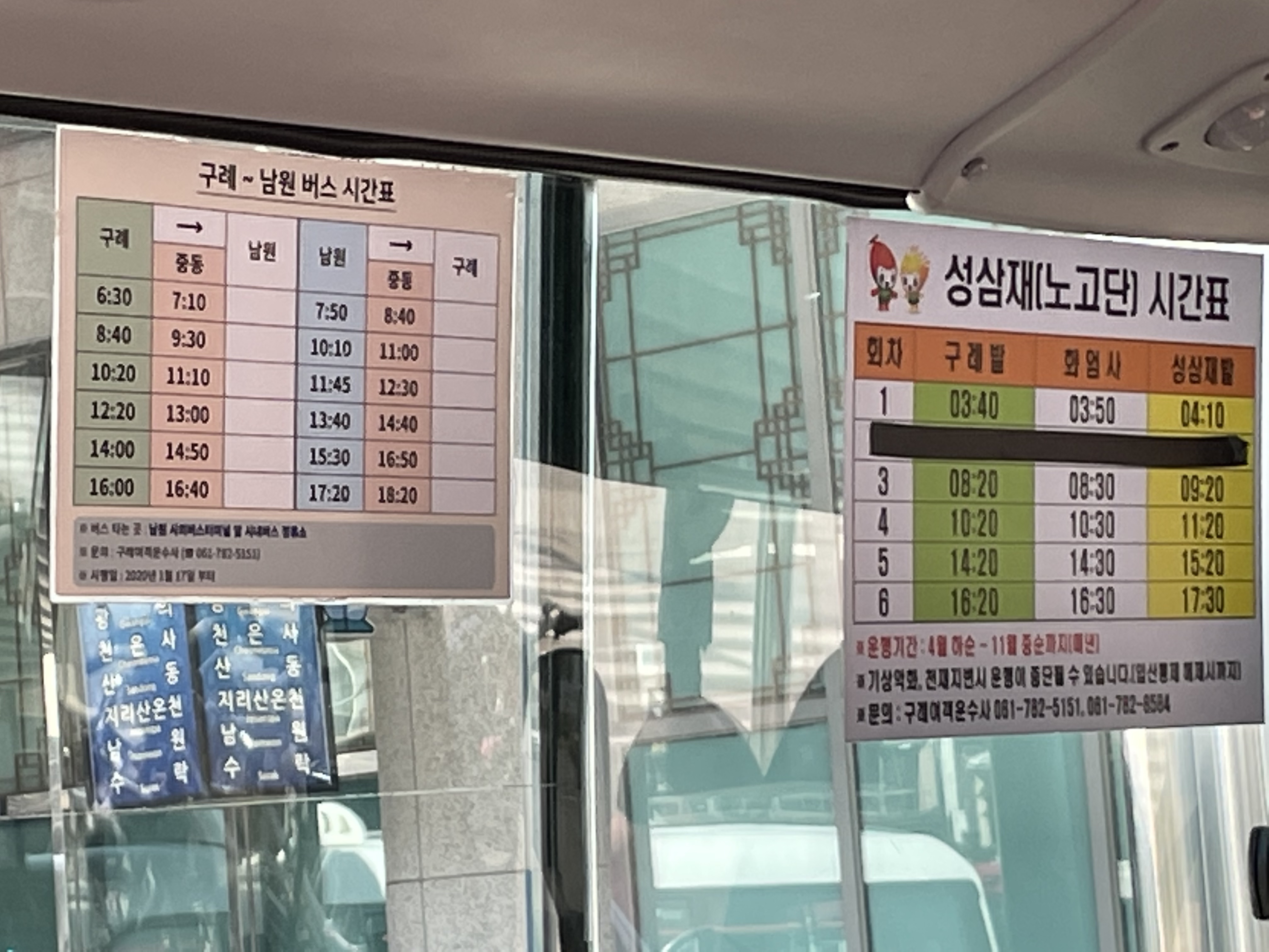 참고로, 서울에서 구례에 (혹은 그 반대) 버스로 가려면 남부터미널로 가자. 노선은 서울 -> 구례 -> 하동(올라올 땐 그 반대). 그리고, 구례에서 남원에 가려면 농어촌버스를 타거나 구례군역에 가서 열차 타는 게 나을 듯.