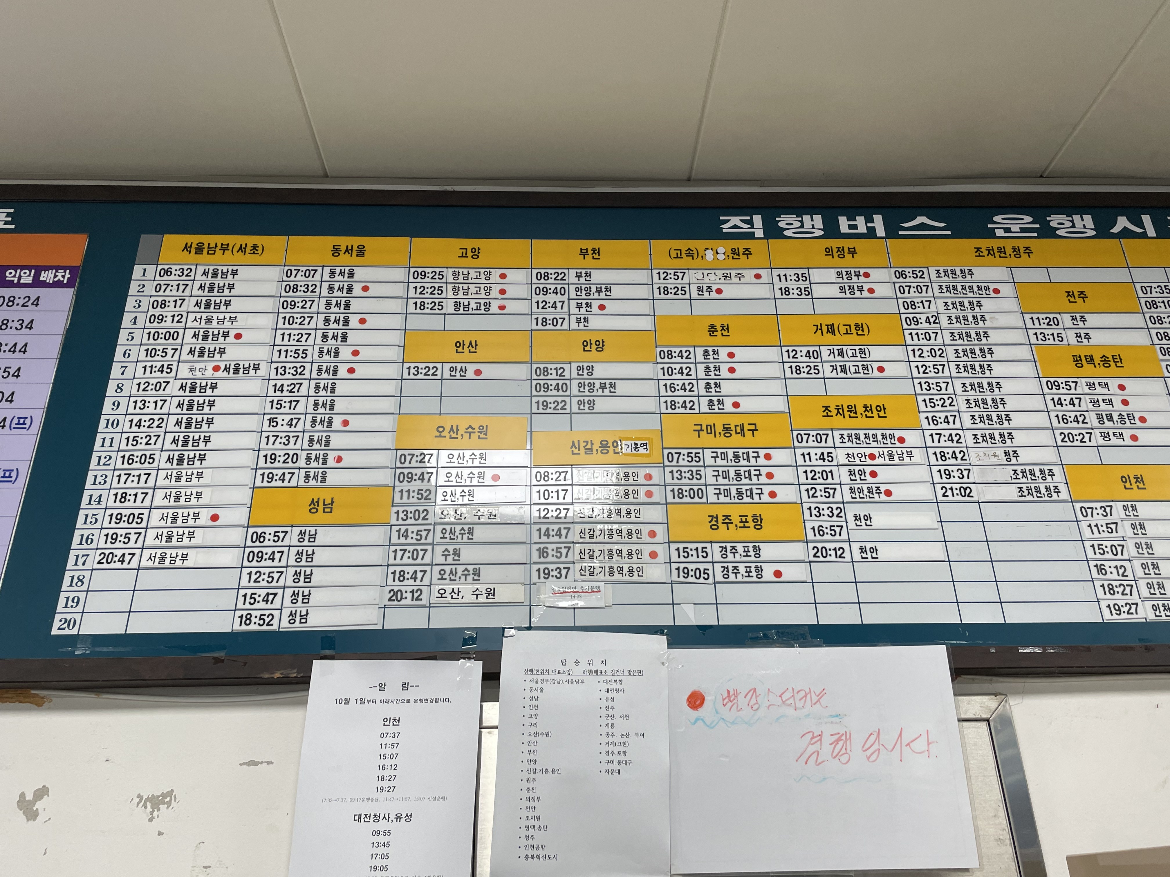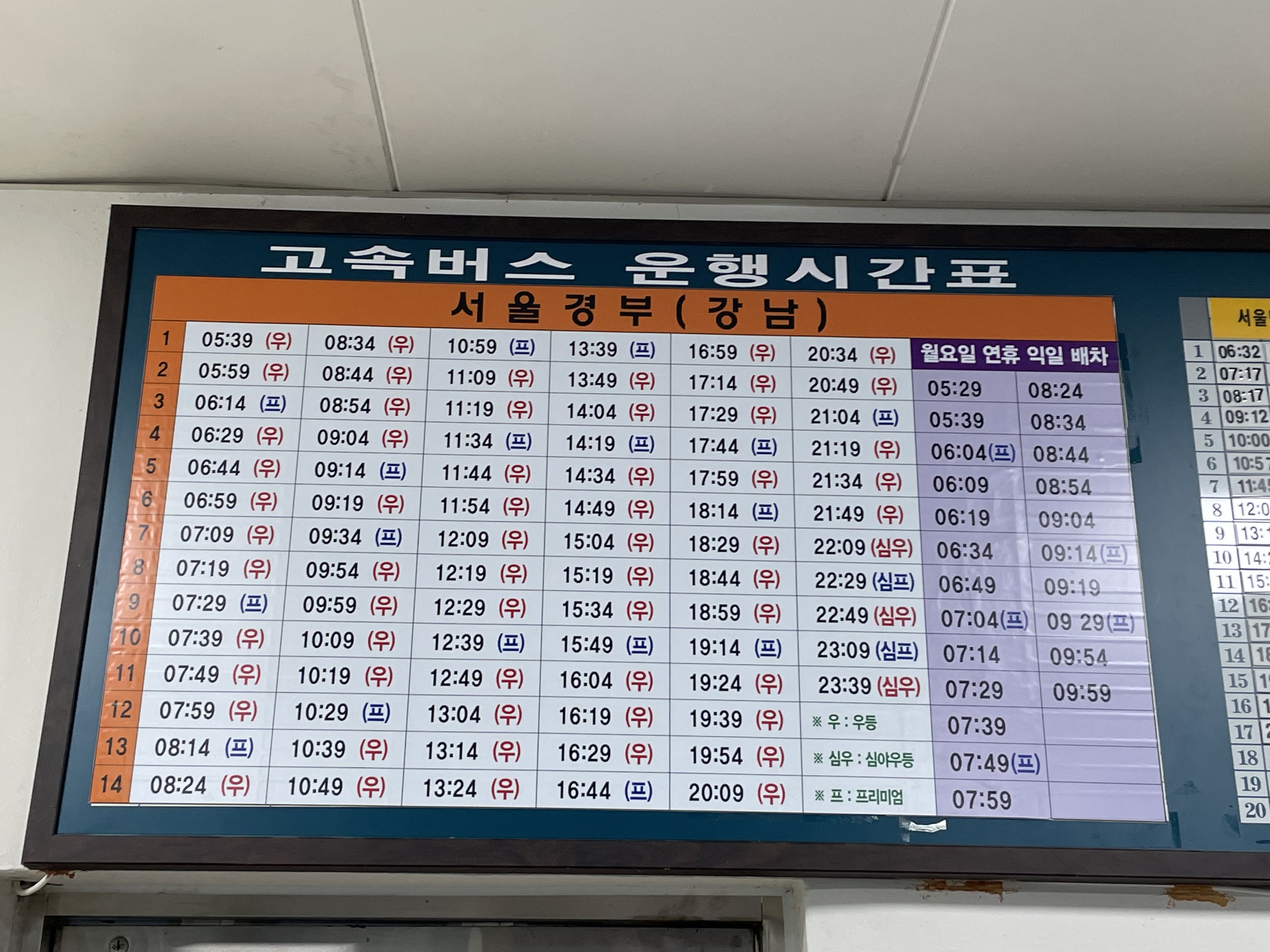 아무래도 세종시 남쪽에 본 터미널이 따로 있는데다 북쪽으로 가는 길이어서 그런지 대부분의 버스가 중부 지방으로 향하는 버스들이었다. 게다가 결행도 많고....
