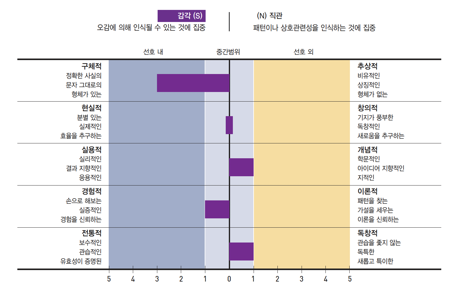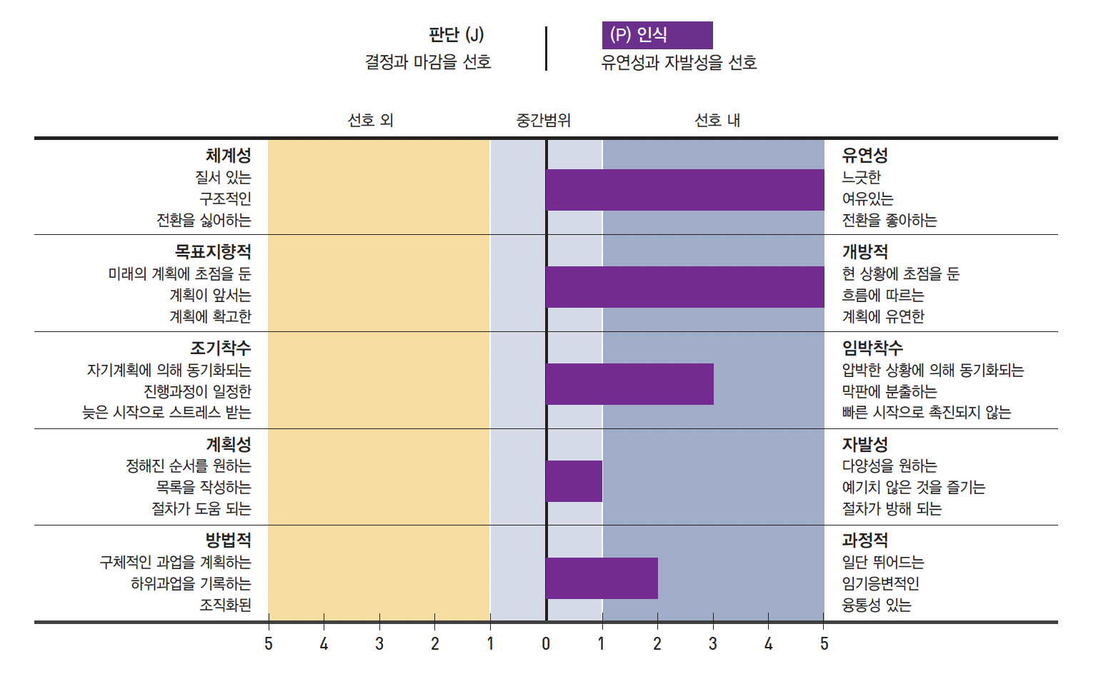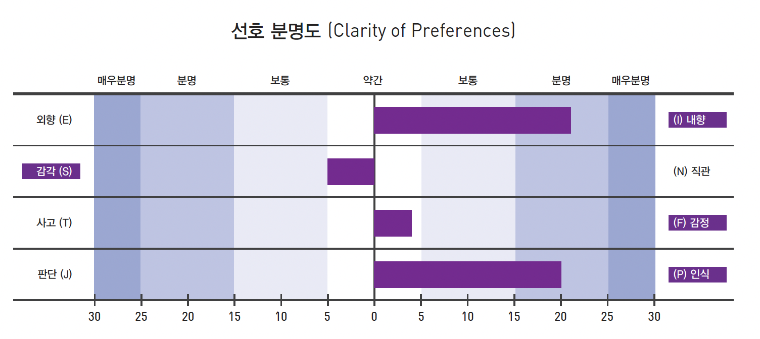 사실 뜬구름잡는 이야기를 별로 안좋아해서 첫 번째 막대기가 긴 거지, 나머지는 거의 양 쪽 성향 모두 가지고 있다고 봐도 될 듯. 보통 사람들이 이 쪽에선 점수가 성향이 확실히 갈리고 다른 알파벳끼리 가장 트러블 나기 쉬운(...) 부분이라고들 하는데, 난 유독 S랑 P가 거의 중간점수로 나오다보니 특이하긴 한 듯.
