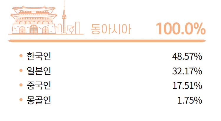 이 글 쓰려고 유튜브 등지에서 다른 사람들의 결과를 봤는데, 확실히 일본인 퍼센트가 높은 편이네(...). 상대적으로 일본인 비율이 높고 중국인 비율이 낮은 편이긴 하다. 친가나 외가 쪽 중 한 곳이 일본이랑 커넥션이 있었나보다.ㅋㅋ 그리고 동남아시아 쪽은 아예 없음(...).