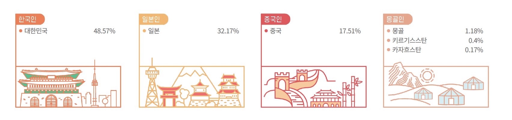 세부적으로 보니, 몽골인 카테고리에 키르기즈인과 카자흐인이 같이 묶여있네. 저 쪽 분들은 이 분류 되게 싫어할 것 같은(...). 어쨌건 우리랑 외모는 거의 같다고 보면 되니(?). 아무튼, 이정도면 찐 동아시아인 이라 봐도 되겠다.