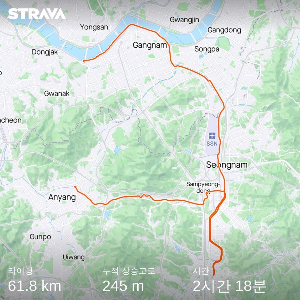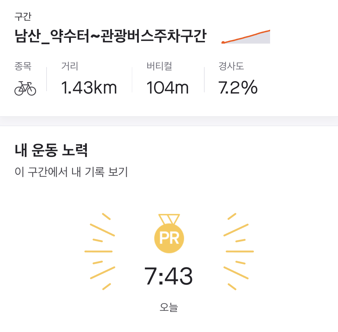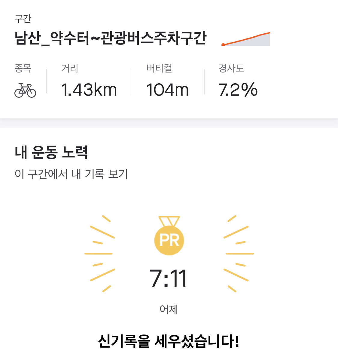 두물머리 라이딩에서 털린 후 3주만에 처음 갔던 라이딩. 짤막하게 남산에만 갔다왔는데, 기록 세웠다!! 지난번 라이딩보다 30초 더 줄였네😆 지난번에 비해 그렇게 힘들지 않았고, 심야시간이라 차도 없어 편한 마음으로 다녀왔더니 좋은 기록이 나왔다 :)
