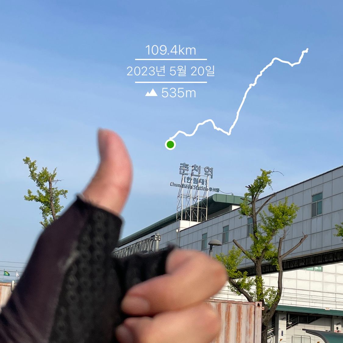 날씨도, 몸상태도 정말 쾌적했던 덕에 다소 늦게 출발+도로 단차에 튜브가 찢어져 펑크 났음에도 해가 지기 전에 춘천역에 도착할 수 있었다. 물론 자전거도 좋고 짐도 가볍긴 했지만 확실히 2.5년 전에 비해 엔진이 는 티가 나더라. 펑크때메 날린 시간만 아니었어도 더 빨리 갔을 듯..