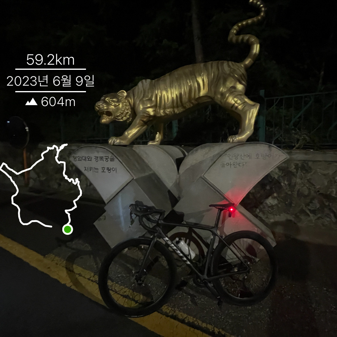 사직공원 초입을 과연 올라갈 수 있을지 걱정했는데, 다행히 욕심부리지 않고 기어를 털었더니 무난히 올라갈 수 #있었다. 게다가 차는 그리 많지 않았고, 후방 센서까지 장착한 상태여서 차 걱정 없이 라이딩할 수 있었다. 그렇게 인왕산 호랑이 앞에서 잠시 멈춰 사진 찍은 후에는 북악까지 한 큐에(?) 무정차로 갔다.