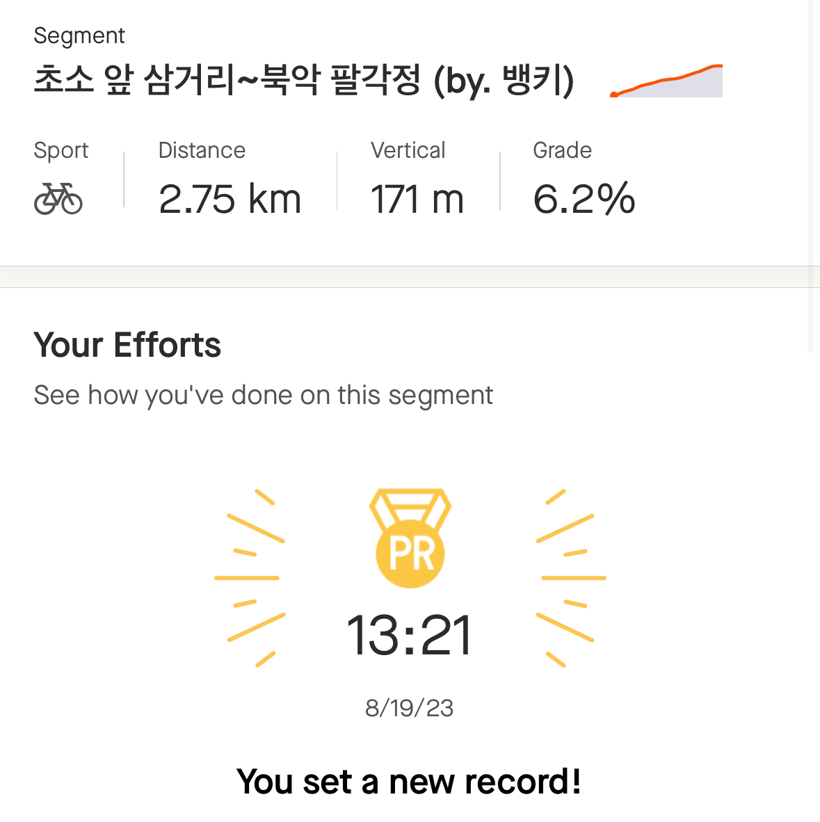 그래도 북악은 남산에서 힘 빼고 간 건데도 최고 기록에서 9초 차이까지 당긴 거라 뿌듯하다. 재작년에 남북 처음 갔을 때 북악에서 3번 정도 멈췄던 거, 그리고 PR 찍었을 땐 오로지 북악만 갔었던 거에 비하면 장족의 발전이지.