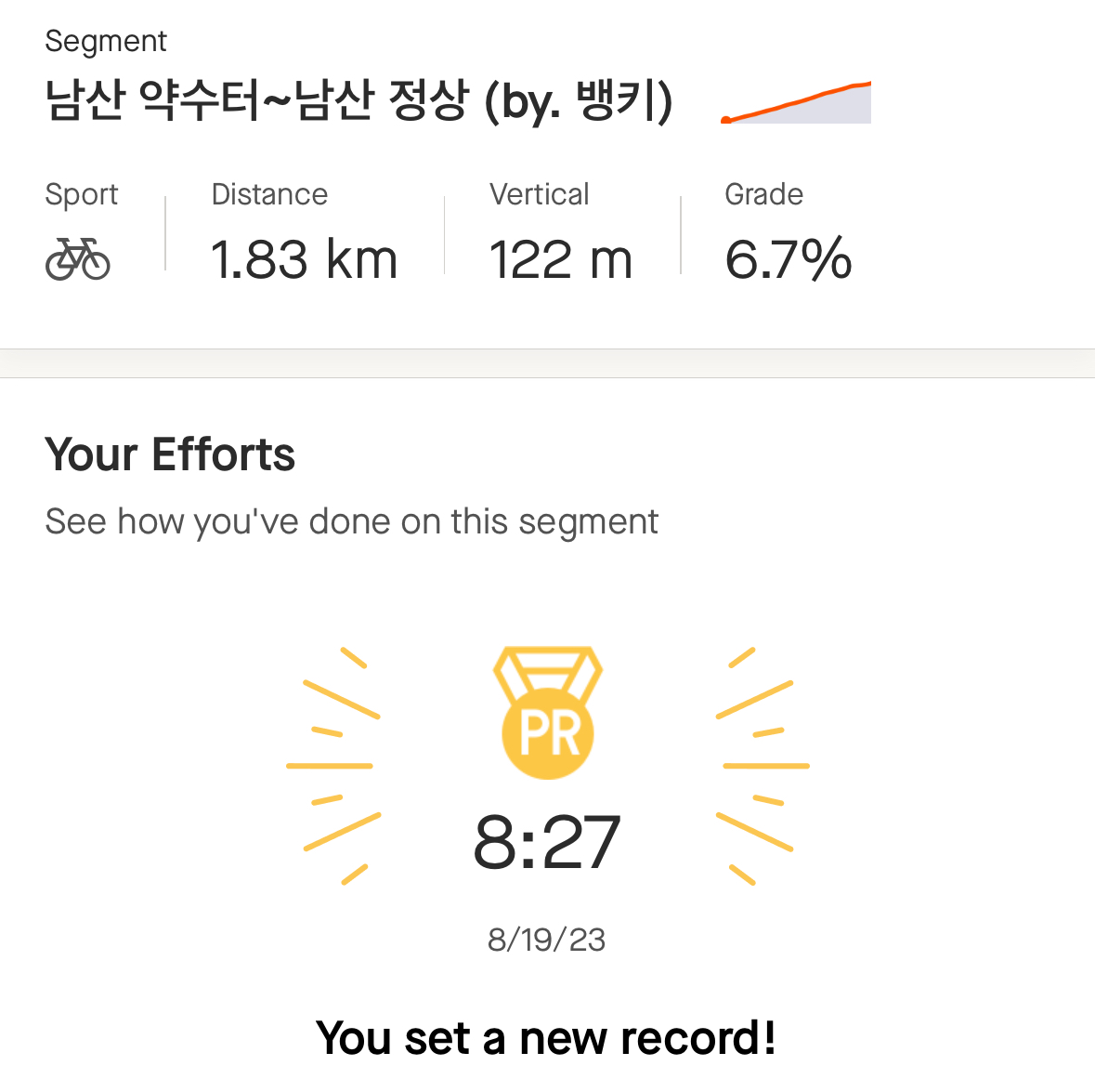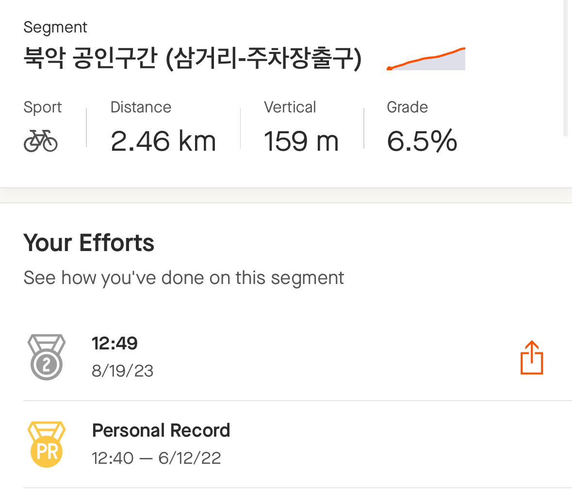 그래도 북악은 남산에서 힘 빼고 간 건데도 최고 기록에서 9초 차이까지 당긴 거라 뿌듯하다. 재작년에 남북 처음 갔을 때 북악에서 3번 정도 멈췄던 거, 그리고 PR 찍었을 땐 오로지 북악만 갔었던 거에 비하면 장족의 발전이지.
