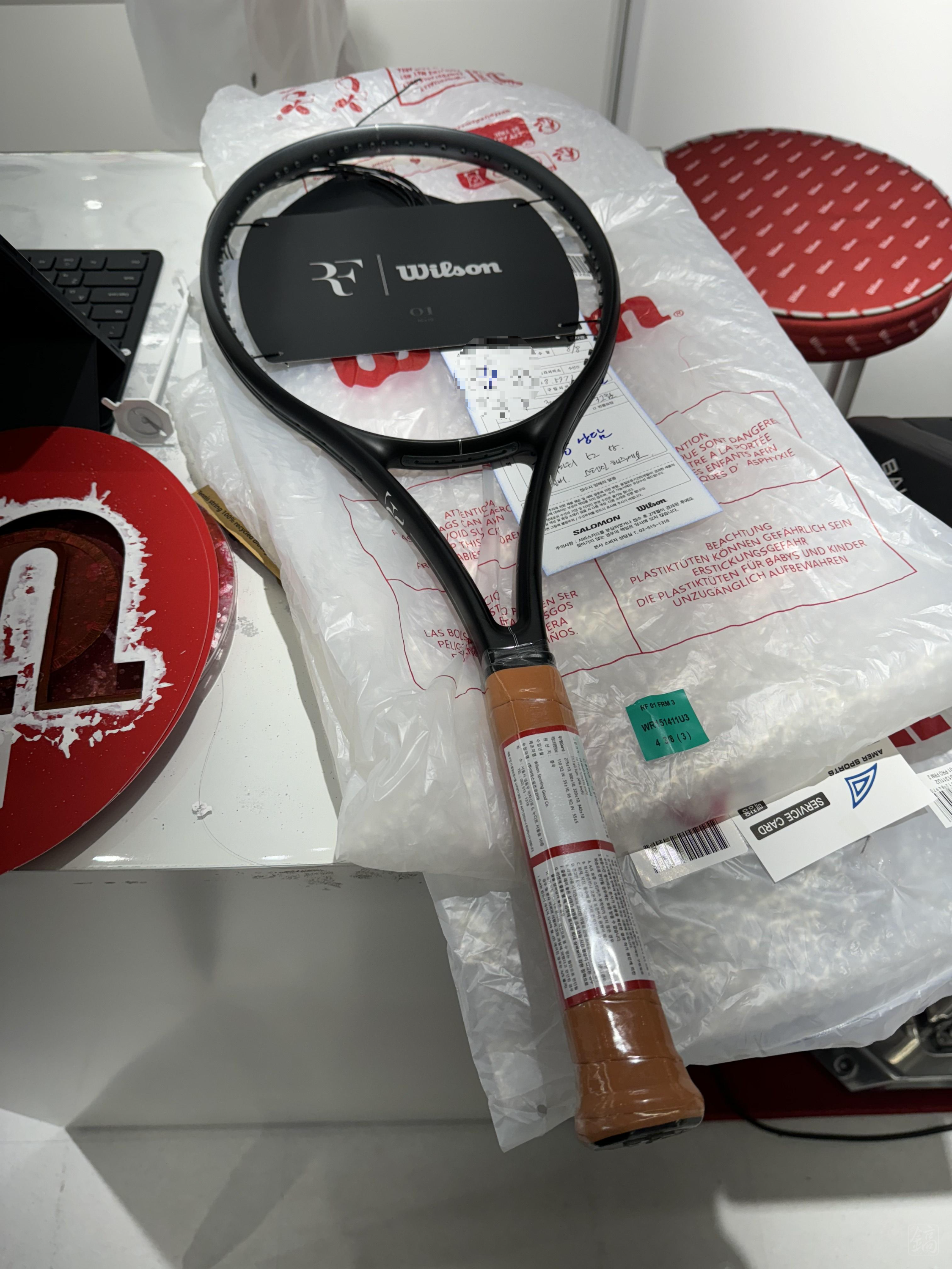 그럼에도 불구하고 원그립의 가죽색과 RF 마크, 하단의 검은 프레임이 고급졌고, 다행히 RF01(300g) 라켓은 3그립도 매장에 재고가 있었기에 문제없이 구매 완료했다. 그리고 윌슨과 협약을 맺은 스트링[각주:1]에 대해 무료 스트링작업 서비스를 제공하고 있었다. 무료로 알루파워 스트링은 못 참지..! 알루파워 소프트만 썼기에 알루파워 역시 궁금하기도 했고.