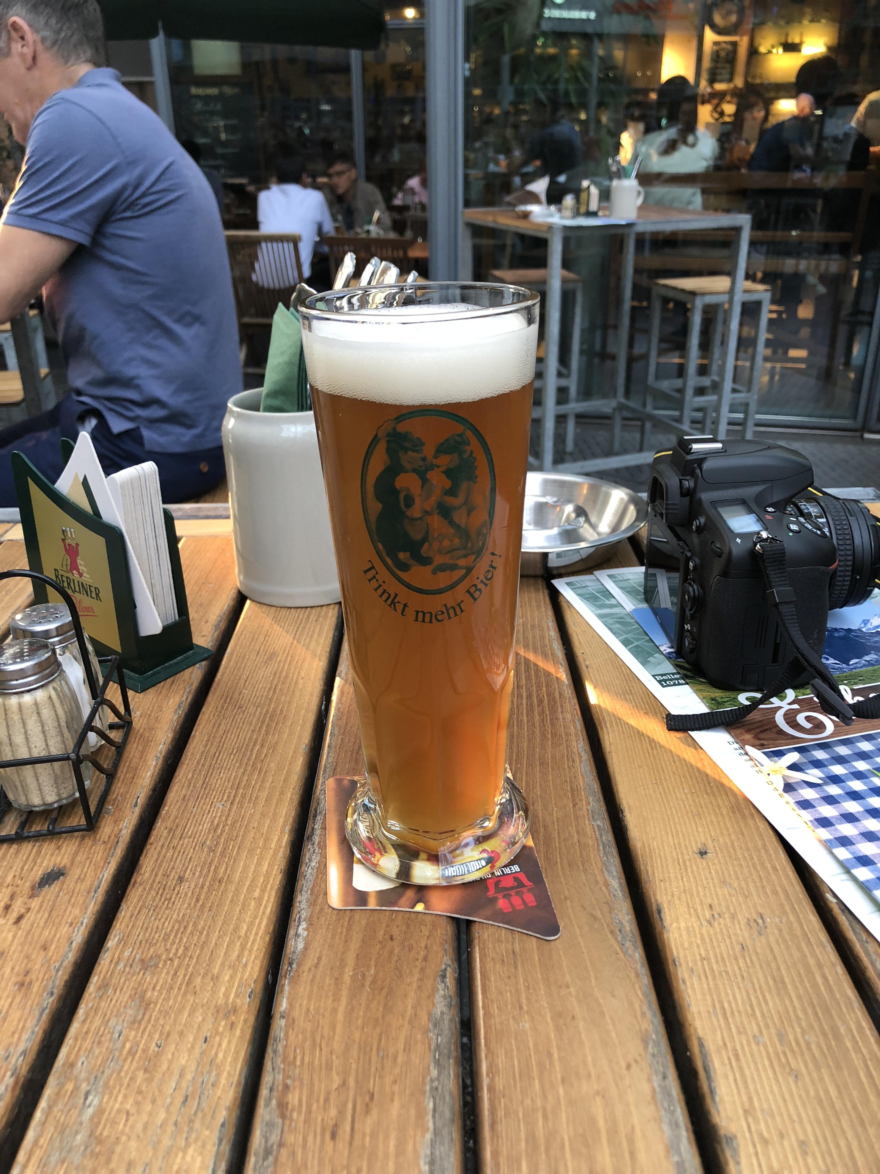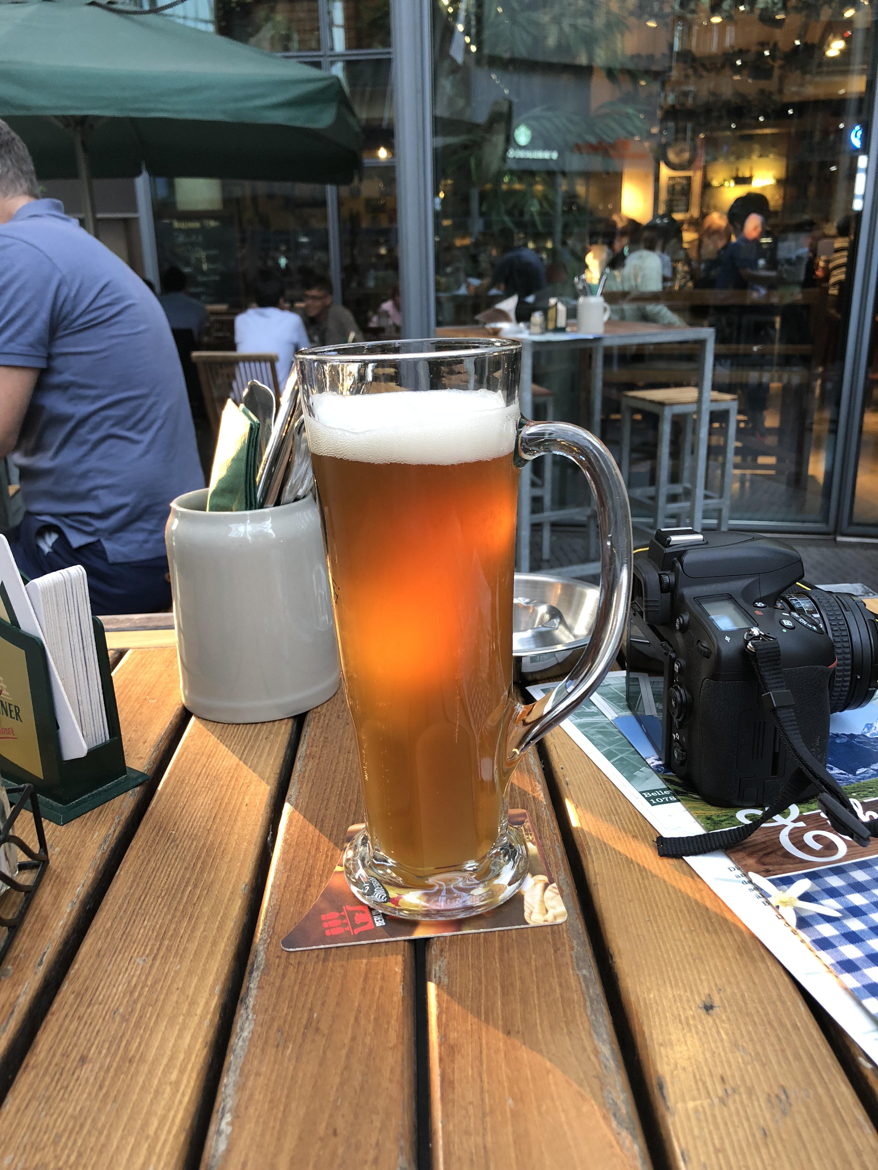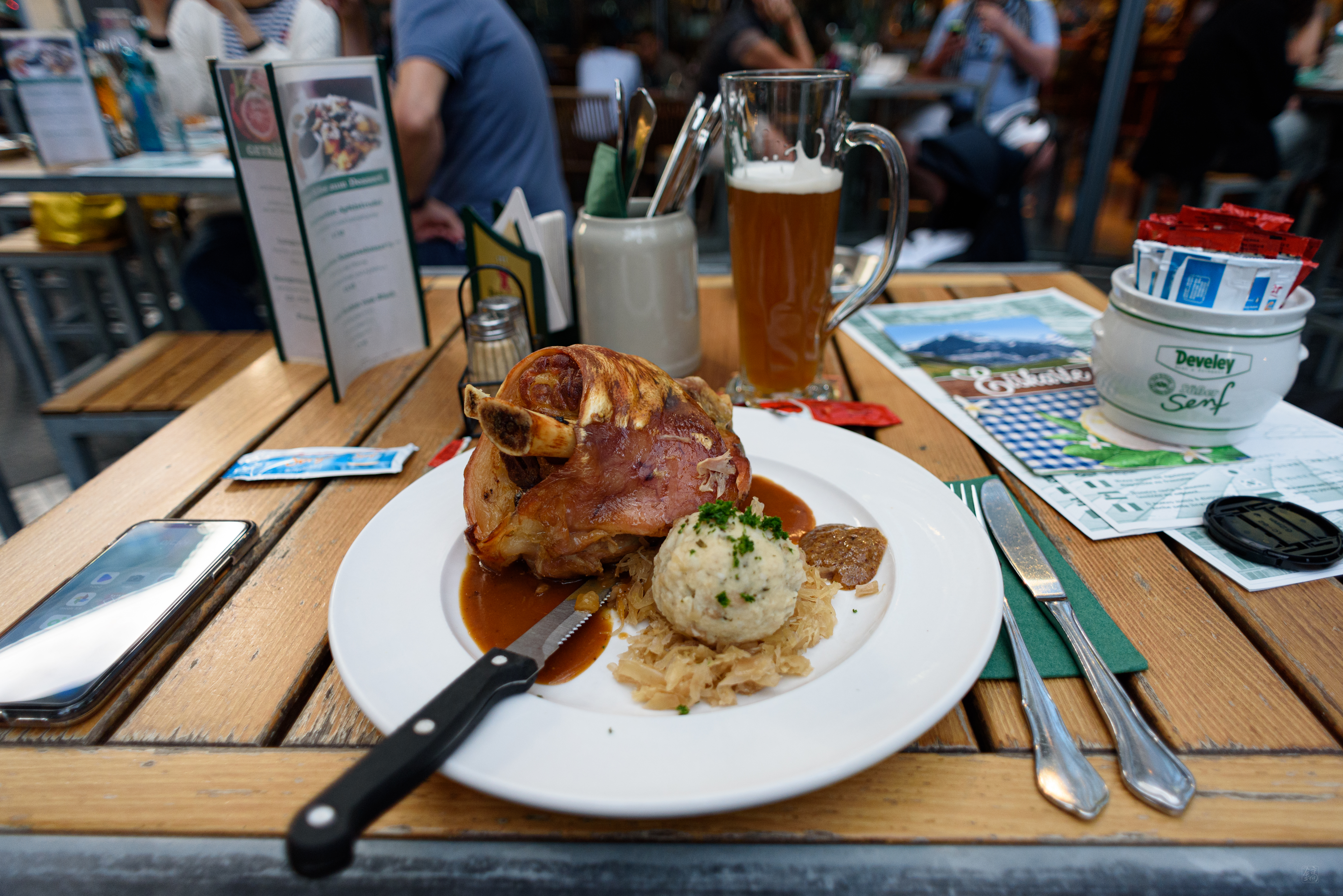 여기서 뭘 먹을까 고민하다, 독일에서 한 번도 안먹어본 슈바인학센을 먹어보기로 하고 야외 테이블에 자리잡았다. 그리고 생맥주도 같이! 먼저 맥주가 나왔고, 맥주는 정말 크... 어딜 가도 예술이었다!! 근데 슈바인학센은... 음... 내 입맛엔 너무 기름지고 짜더라. 첫 기억이 그다지 좋진 않았음.