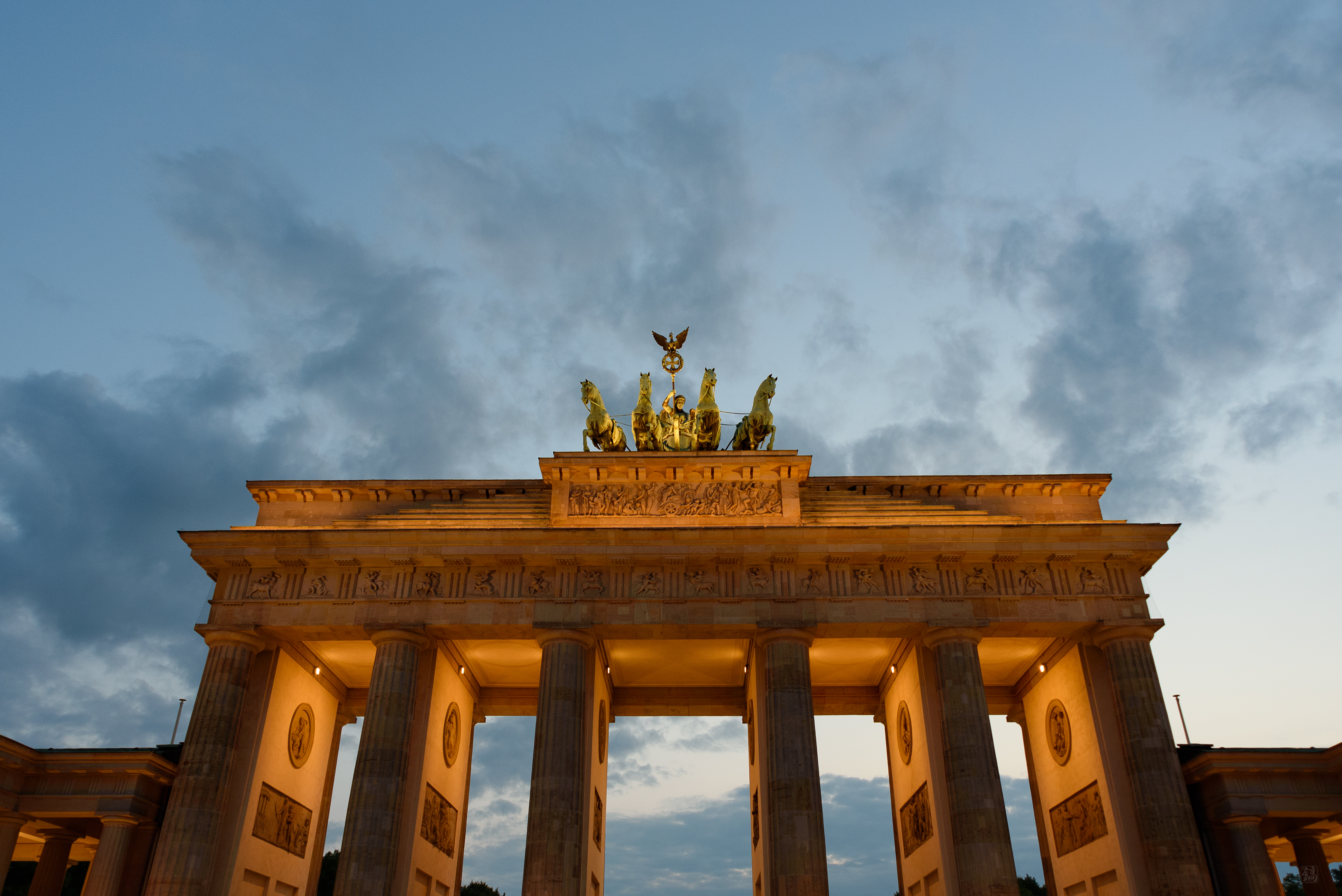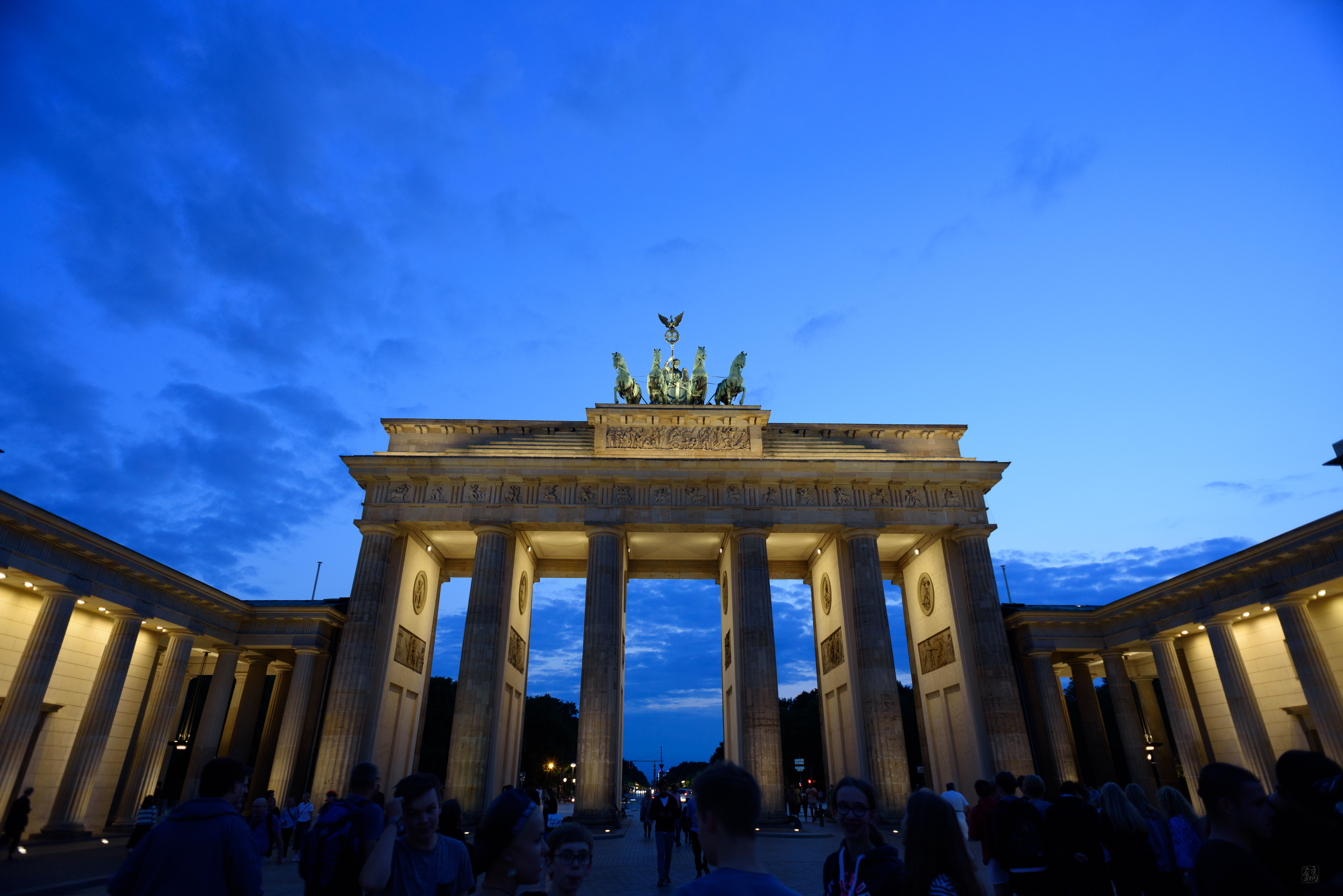 비석 사이에서 빠져나가 큰 길 따라 걸어가니 브란덴부르크문이 보였다! 이야, 드디어 동서독 분단의 상징에 왔구나...! 저 멀리 해가 넘어가고 하늘이 어두워지며 조명이 켜져있었는데, 역사의 한중간에 서있는 듯했다. 거대한 기둥과 그 위의 사두마차는 보고만 있어도 웅장했다.