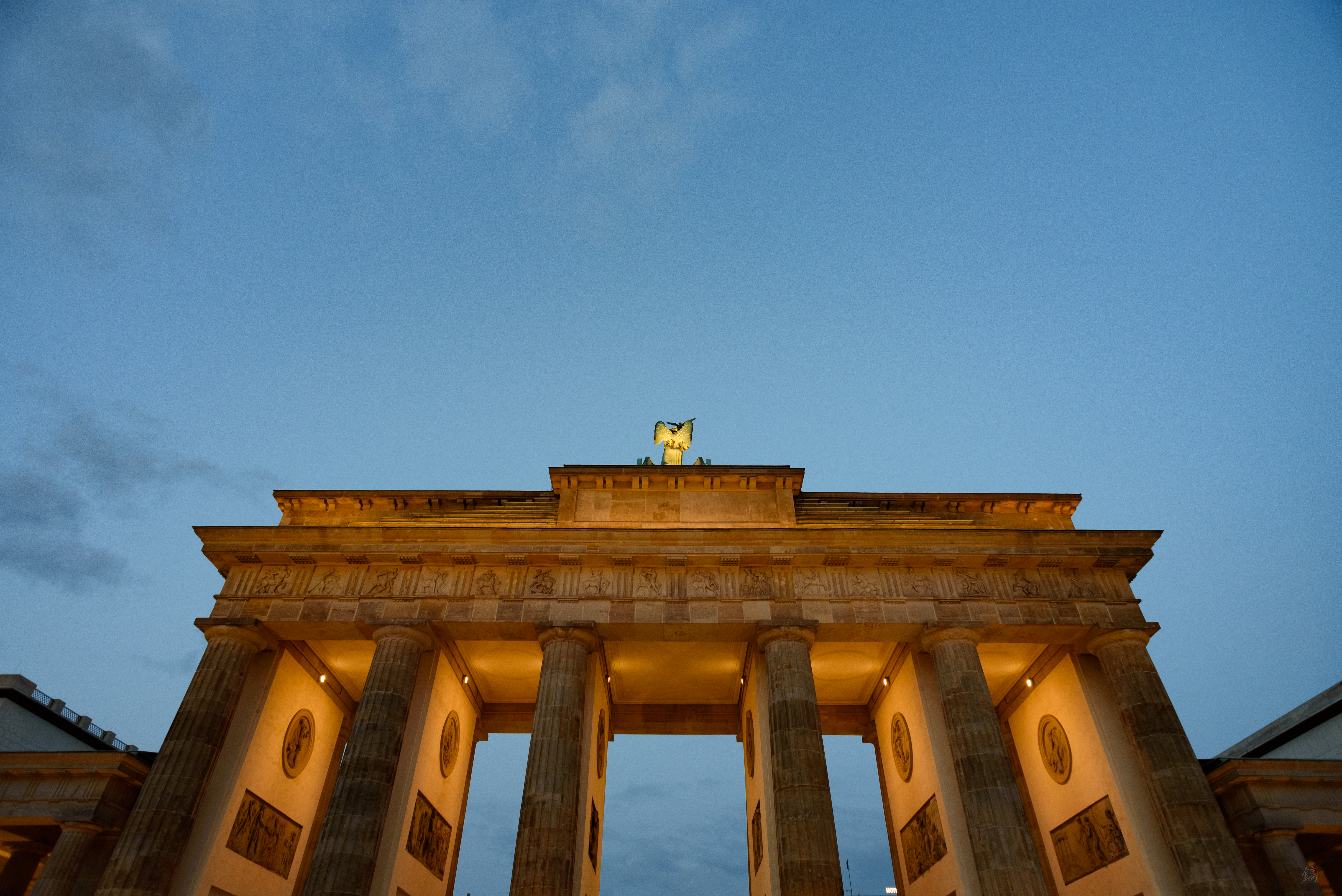비석 사이에서 빠져나가 큰 길 따라 걸어가니 브란덴부르크문이 보였다! 이야, 드디어 동서독 분단의 상징에 왔구나...! 저 멀리 해가 넘어가고 하늘이 어두워지며 조명이 켜져있었는데, 역사의 한중간에 서있는 듯했다. 거대한 기둥과 그 위의 사두마차는 보고만 있어도 웅장했다.
