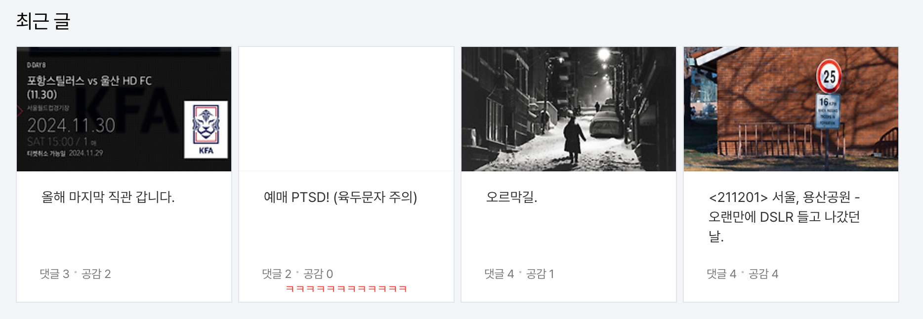또다시 잡설. 2024.11.23 22:00 IT/Blog 반응형 1. 어느새 80% 좀이따 날 바뀌고 글 하나 더 올리면 더 올라가겠구만. 이제 고지가 얼마 안남았다! 2. 뭐 쓰지? 일단 내일이랑 내일모레 올릴 건 정리해뒀는데, 마지막 2일을 뭘로 할지 고민된다. 생각 좀 해봐야겠음.. 3. 아쉽네.. PTSD 글에도 댓글 한 번 달아보시지? ㅋㅋㅋㅋ 봇들이 이런 건 또 귀신같이 알아보네. 동조하면 블로그 나락갈까봐 그러니? ㅋㅋㅋㅋ 공유하기 게시글 관리 Echte Liebe 저작자표시 비영리 변경금지 (새창열림) 'IT > Blog' 카테고리의 다른 글 오블완 클리어! (2) 2024.11.27 오늘은 더 어이가 없구나? (2) 2024.11.25 오호, 어느새... (4) 2024.11.19 블로그 잡설. (6) 2024.11.10 내가 이러니 빡이 치지!! (2) 2024.11.05 댓글 공유하기 다른 글 댓글 이 글 공유하기 구독하기 구독하기 카카오톡 카카오톡 라인 라인 트위터 트위터 Facebook Facebook 카카오스토리 카카오스토리 밴드 밴드 네이버 블로그 네이버 블로그 Pocket Pocket Evernote Evernote 다른 글 오블완 클리어! 오블완 클리어! 2024.11.27 오늘은 더 어이가 없구나? 오늘은 더 어이가 없구나? 2024.11.25 오호, 어느새... 오호, 어느새... 2024.11.19 블로그 잡설. 블로그 잡설. 2024.11.10 다른 글 더 둘러보기