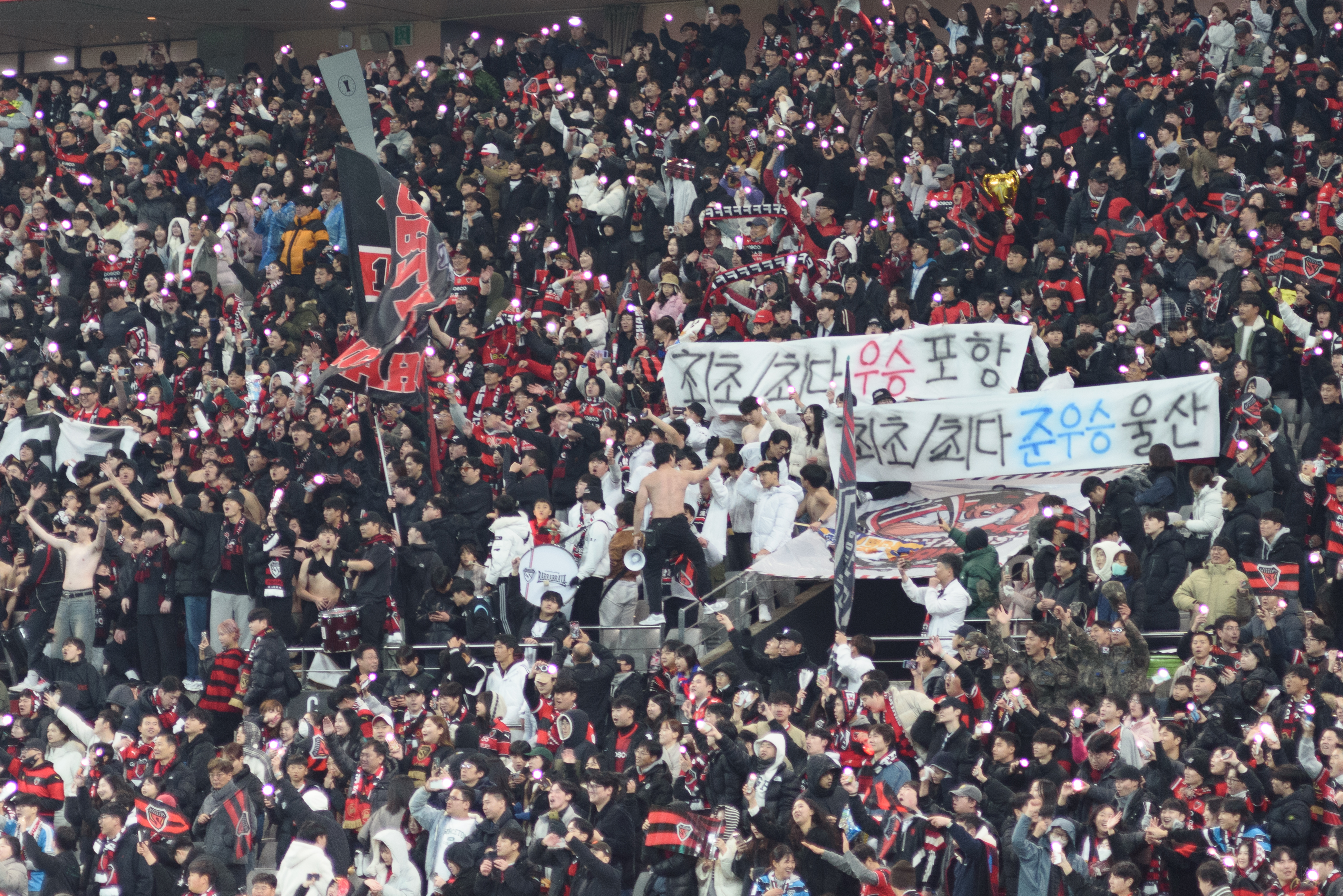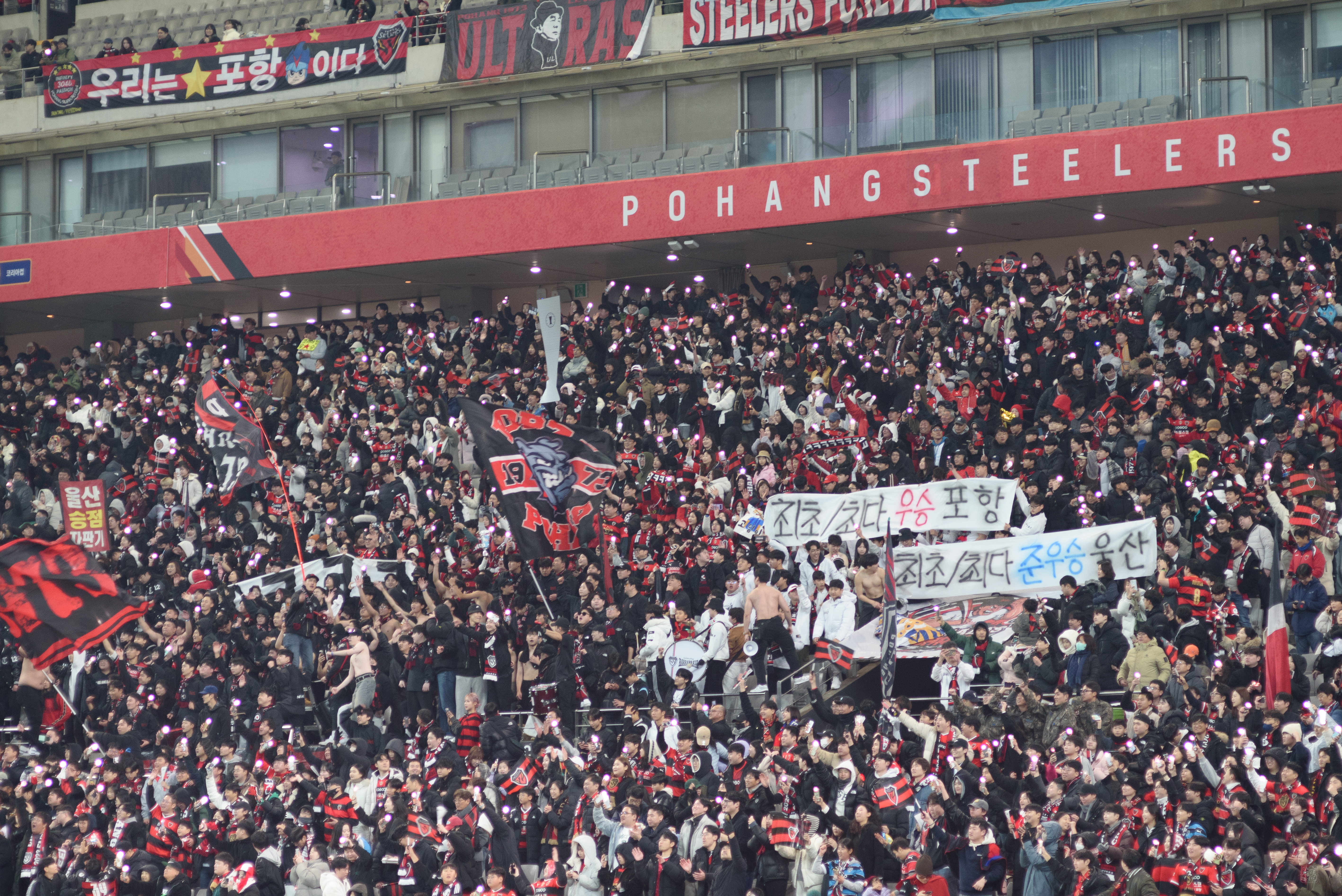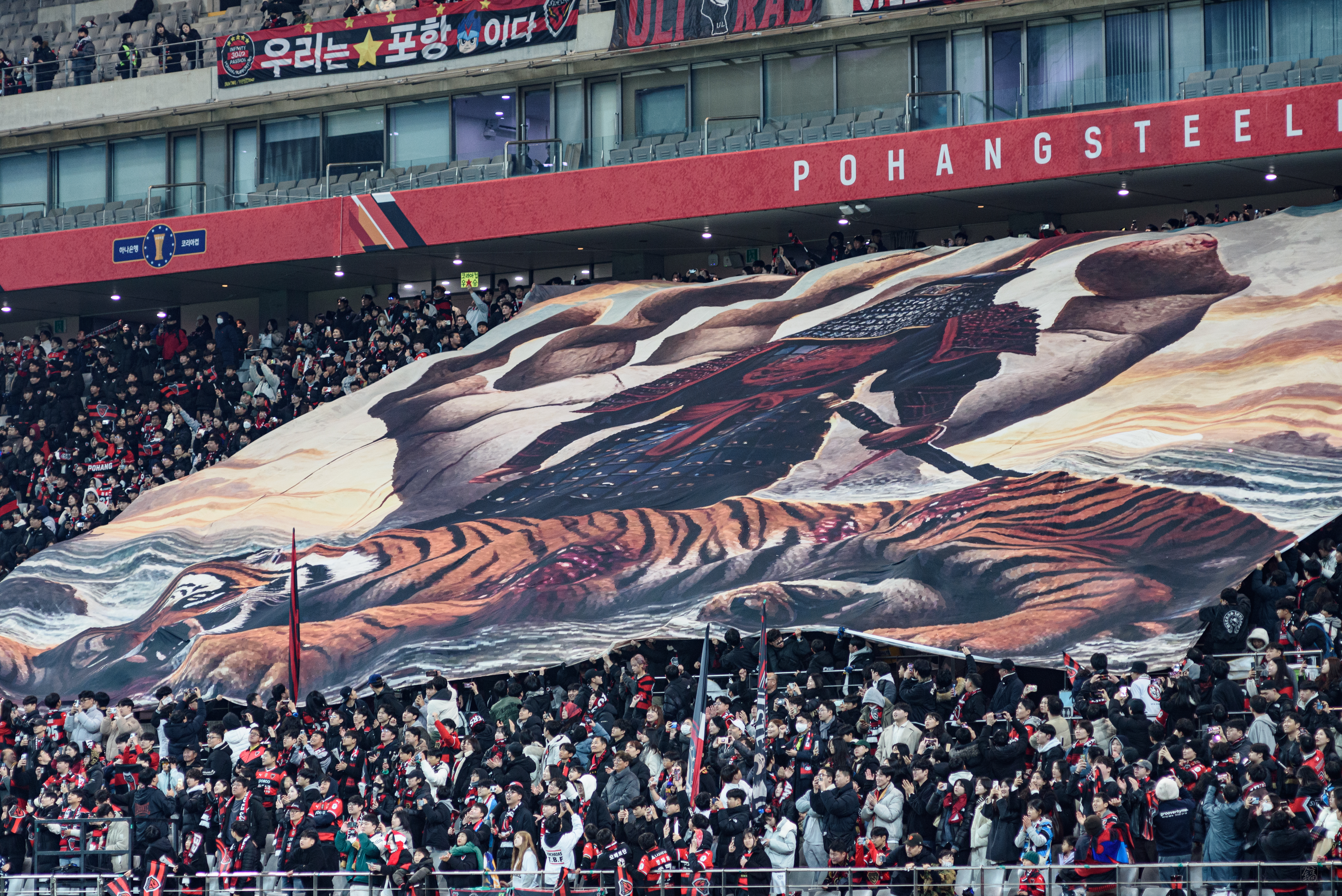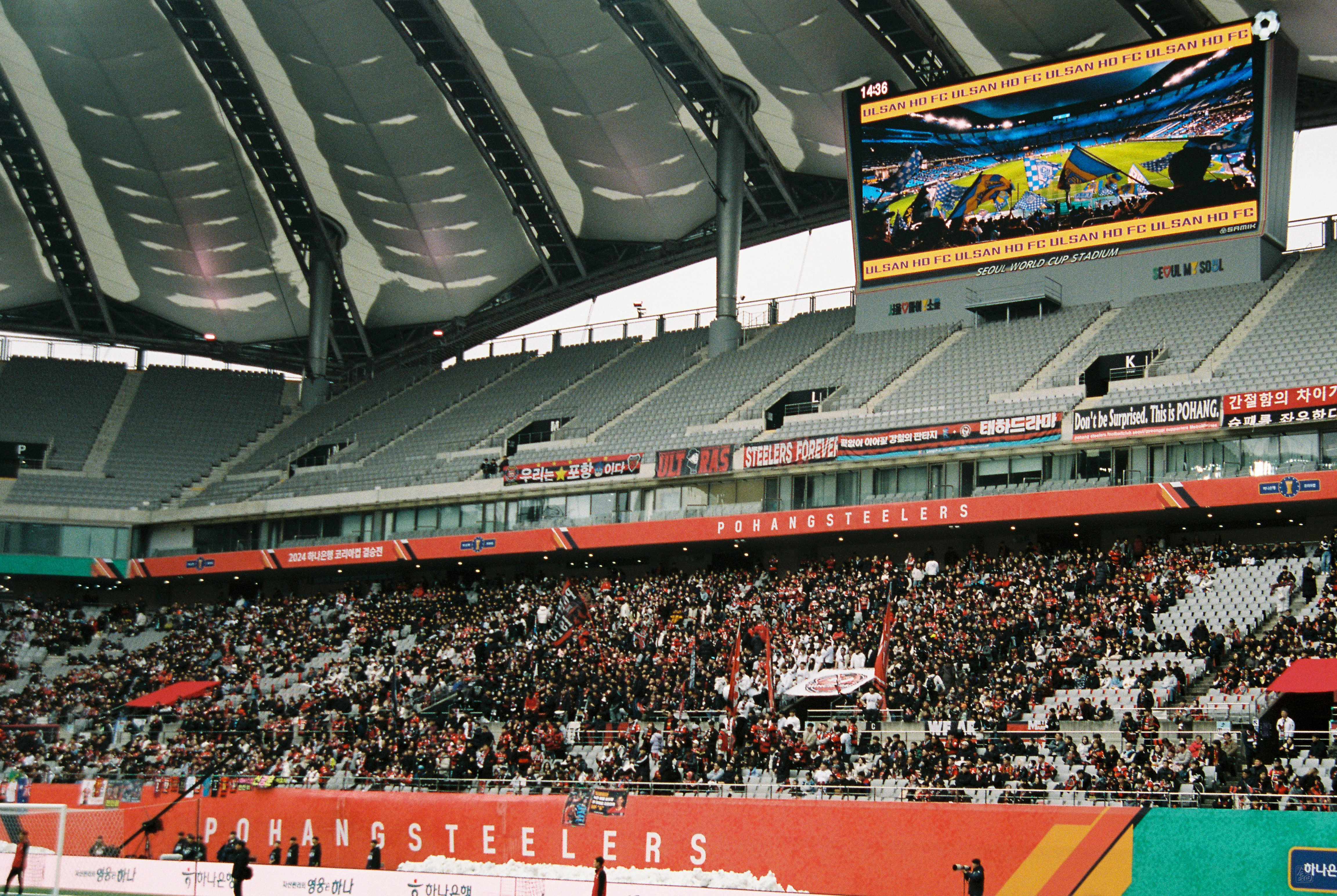 와, 사람 정말 많이 왔더라. 포항은 N석을 이미 가득 채웠고, 울산도 응원석이 빽빽히 들어찼더라(눈 때문에 절반 정도를 못 앉게 해서 좀 휑해 보이긴 했으나..). 이 날 공식 관중수가 27,138명인가 그랬는데, 양 쪽이 모두 서포터들로 빽빽이 들어찬 데다 둘 다 어디 가서 응원콜로 밀리는 팀들이 아니고, 상암 자체가 수용 관중수가 많은 구장이다 보니 정말.. 다른 경기와는 급이 다른 열기였다. 특히 우리 팀이 응원 준비를 엄청 잘해왔다는 게 체감됐다. 덕분에 약간 유럽 축구 경기를 직관하는 느낌을 받았고, 그 공기를 하나하나 카메라에 담았다.