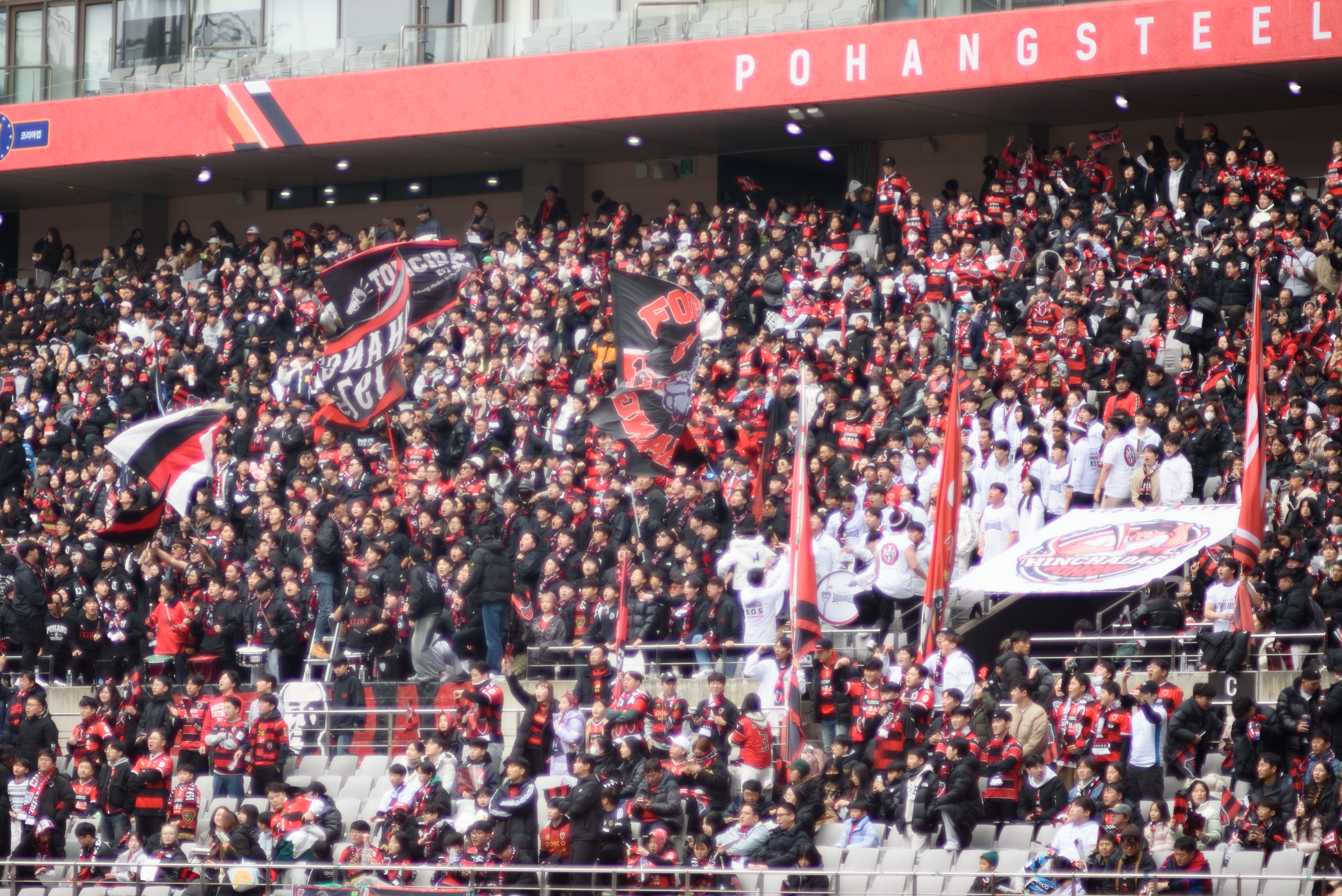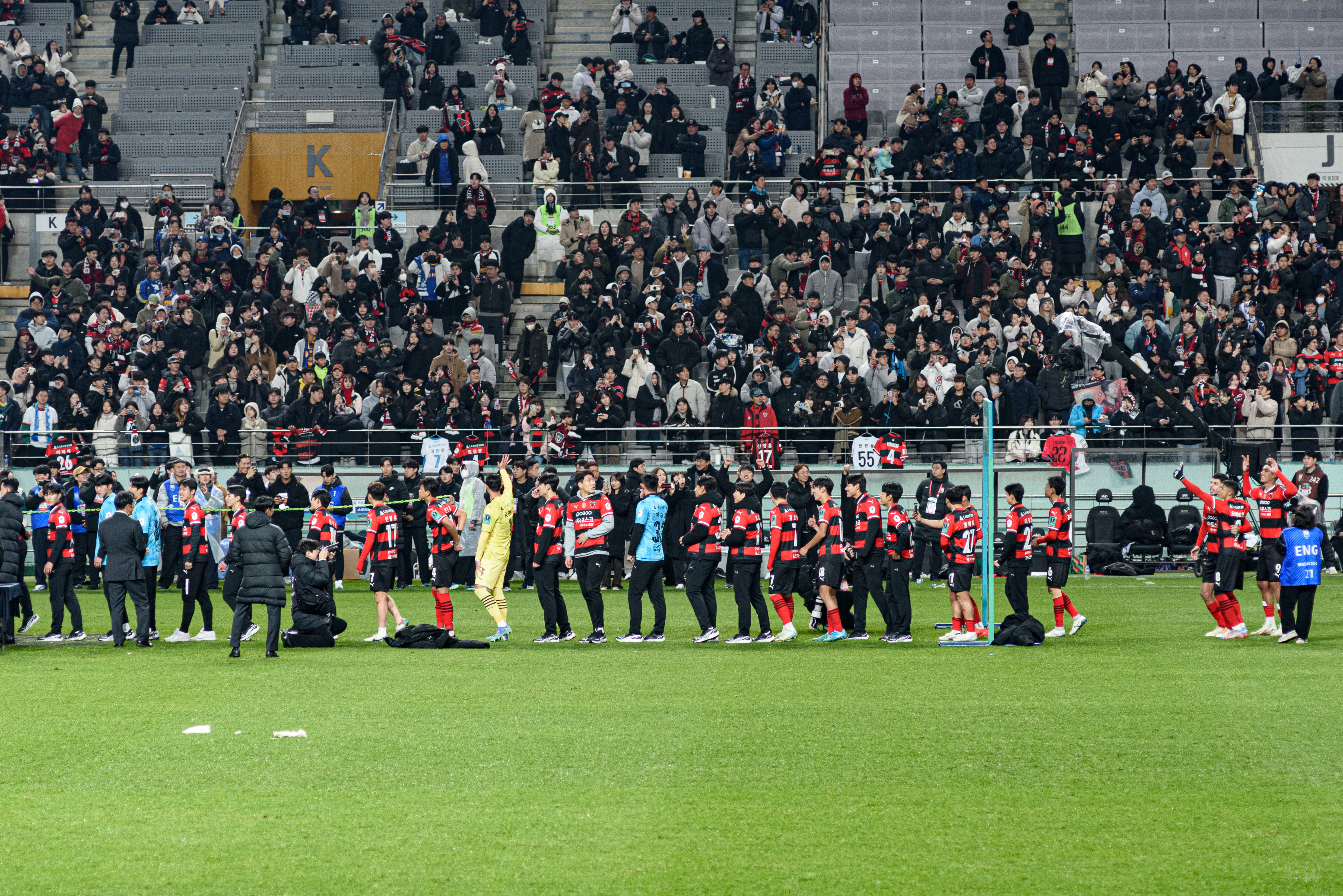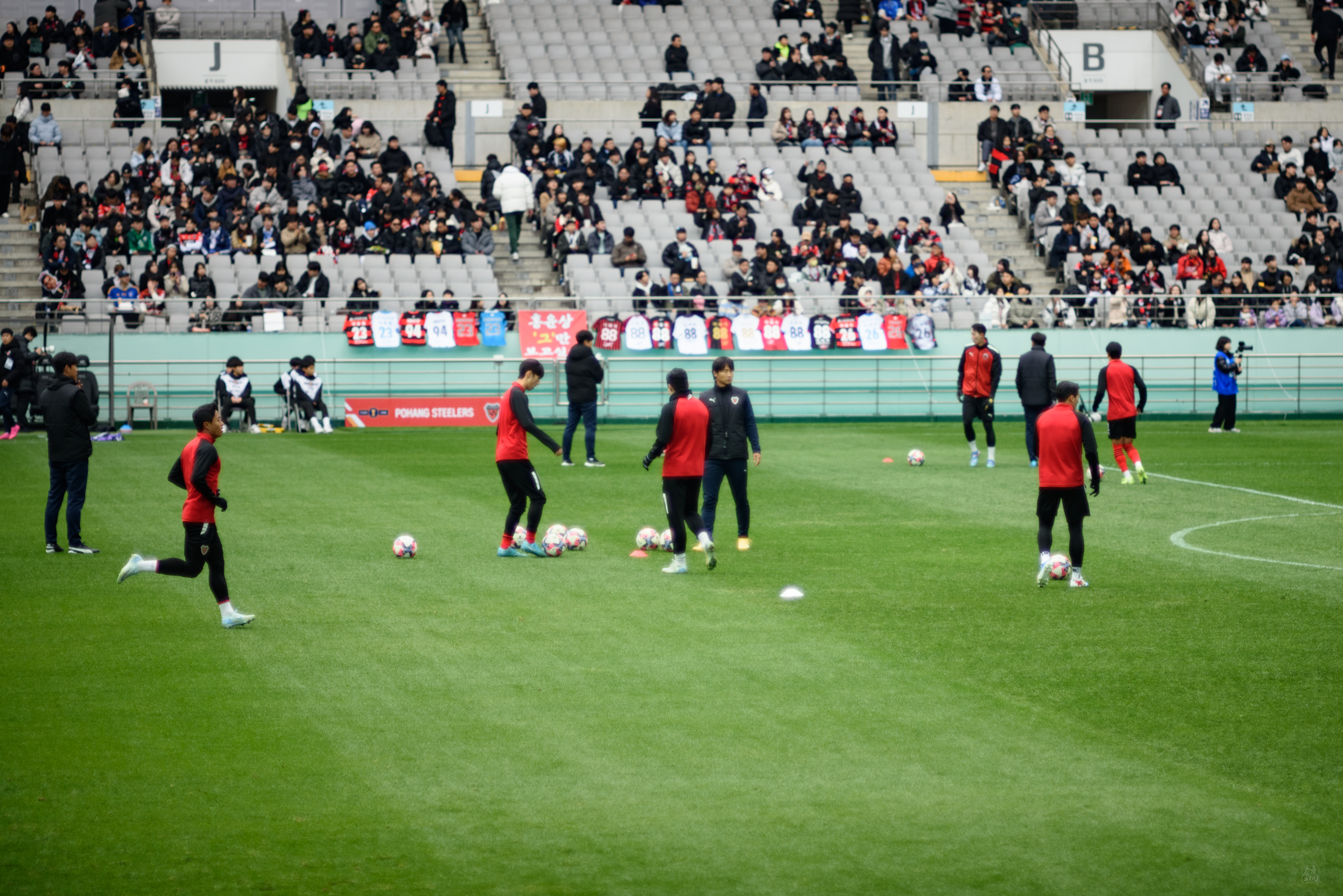 와, 사람 정말 많이 왔더라. 포항은 N석을 이미 가득 채웠고, 울산도 응원석이 빽빽히 들어찼더라(눈 때문에 절반 정도를 못 앉게 해서 좀 휑해 보이긴 했으나..). 이 날 공식 관중수가 27,138명인가 그랬는데, 양 쪽이 모두 서포터들로 빽빽이 들어찬 데다 둘 다 어디 가서 응원콜로 밀리는 팀들이 아니고, 상암 자체가 수용 관중수가 많은 구장이다 보니 정말.. 다른 경기와는 급이 다른 열기였다. 특히 우리 팀이 응원 준비를 엄청 잘해왔다는 게 체감됐다. 덕분에 약간 유럽 축구 경기를 직관하는 느낌을 받았고, 그 공기를 하나하나 카메라에 담았다.