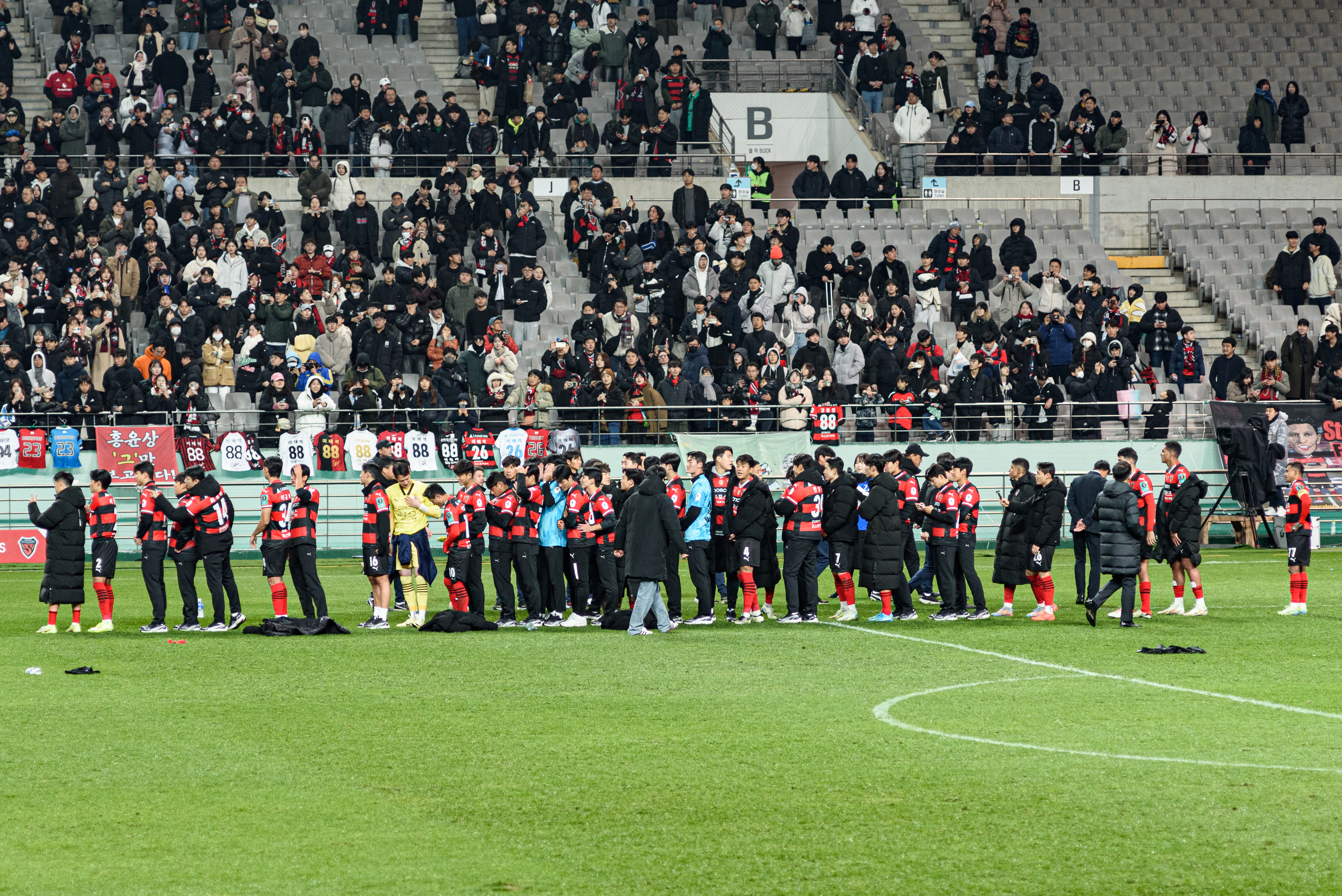 국민의례가 끝난 후 선수들이 서포터즈에 인사를 드리며 결의를 다졌고, 경기가 시작되었다!