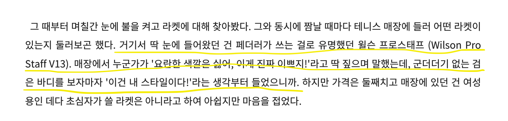 지난 주말 아침까지만 해도 그 마음은 변함이 없었다. 하지만 약 반나절 후, 난 새 라켓을 손에 쥐고 쥐고 집으로 걸어가고 있었다. 아니 노말원씨, 이중인격자세요?라고 말할까 봐 그 히스토리 중 일부는 아래에 접어뒀다. 접은 글의 내용을 한 줄로 요약하자면, 토요일 낮에 테니스 게임을 하던 중 라켓 프레임에 금이 가서 새로 사야했는데, 어떻게 해야할지 고민했다는 이야기다.