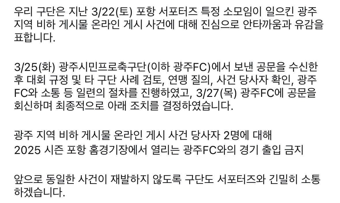 <축구> 포항 레반테 서포터 지역비하발언 관연 스틸러스 입장문. 2025.03.27 12:25 Sports/Football 반응형 https://www.instagram.com/p/DHr4jiDz6mo/?igsh=cTlxem42M2VyNXA5 스틸러스야 뭐하냐?이러고 그냥 끝이야?이걸로 끝이라고?와 포항 팬으로서 환멸감 느껴지네.. 공유하기 게시글 관리 Echte Liebe 'Sports > Football' 카테고리의 다른 글 <축구> [오피셜] 기성용 - 포항과 계약. (8) 2025.07.03 <축구> 기성용 - 포항 (0) 2025.06.24 <Fussball, 축구> 빠른 감독 교체 후 살아나는 BVB, 이러지도 저러지도 못하며 가라앉는 스틸러스. (0) 2025.03.02 한국 축구의 명복을 빕니다. (6) 2025.02.26 <Fussball> [오피셜] BVB, 후임 감독으로 니코 코바치 선임. (0) 2025.01.30 댓글 공유하기 다른 글 댓글 이 글 공유하기 구독하기 구독하기 카카오톡 카카오톡 라인 라인 트위터 트위터 Facebook Facebook 카카오스토리 카카오스토리 밴드 밴드 네이버 블로그 네이버 블로그 Pocket Pocket Evernote Evernote 다른 글 <축구> [오피셜] 기성용 - 포항과 계약. <축구> [오피셜] 기성용 - 포항과 계약. 2025.07.03 <축구> 기성용 - 포항 <축구> 기성용 - 포항 2025.06.24 <Fussball, 축구> 빠른 감독 교체 후 살아나는 BVB, 이러지도 저러지도 못하며 가라앉는 스틸러스. <Fussball, 축구> 빠른 감독 교체 후 살아나는 BVB, 이러지도 저러지도 못하며 가라앉는 스틸러스. 2025.03.02 한국 축구의 명복을 빕니다. 한국 축구의 명복을 빕니다. 2025.02.26 다른 글 더 둘러보기