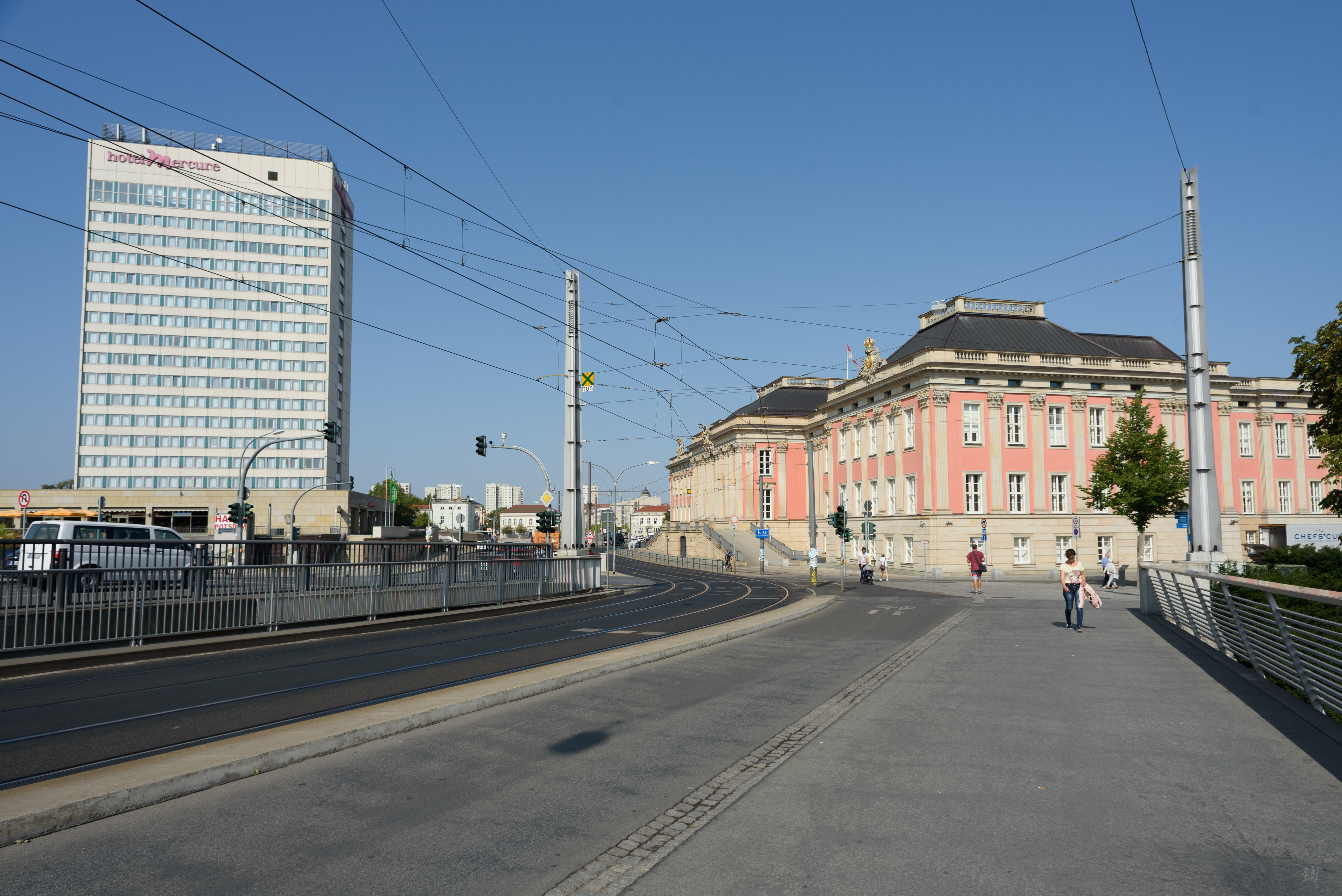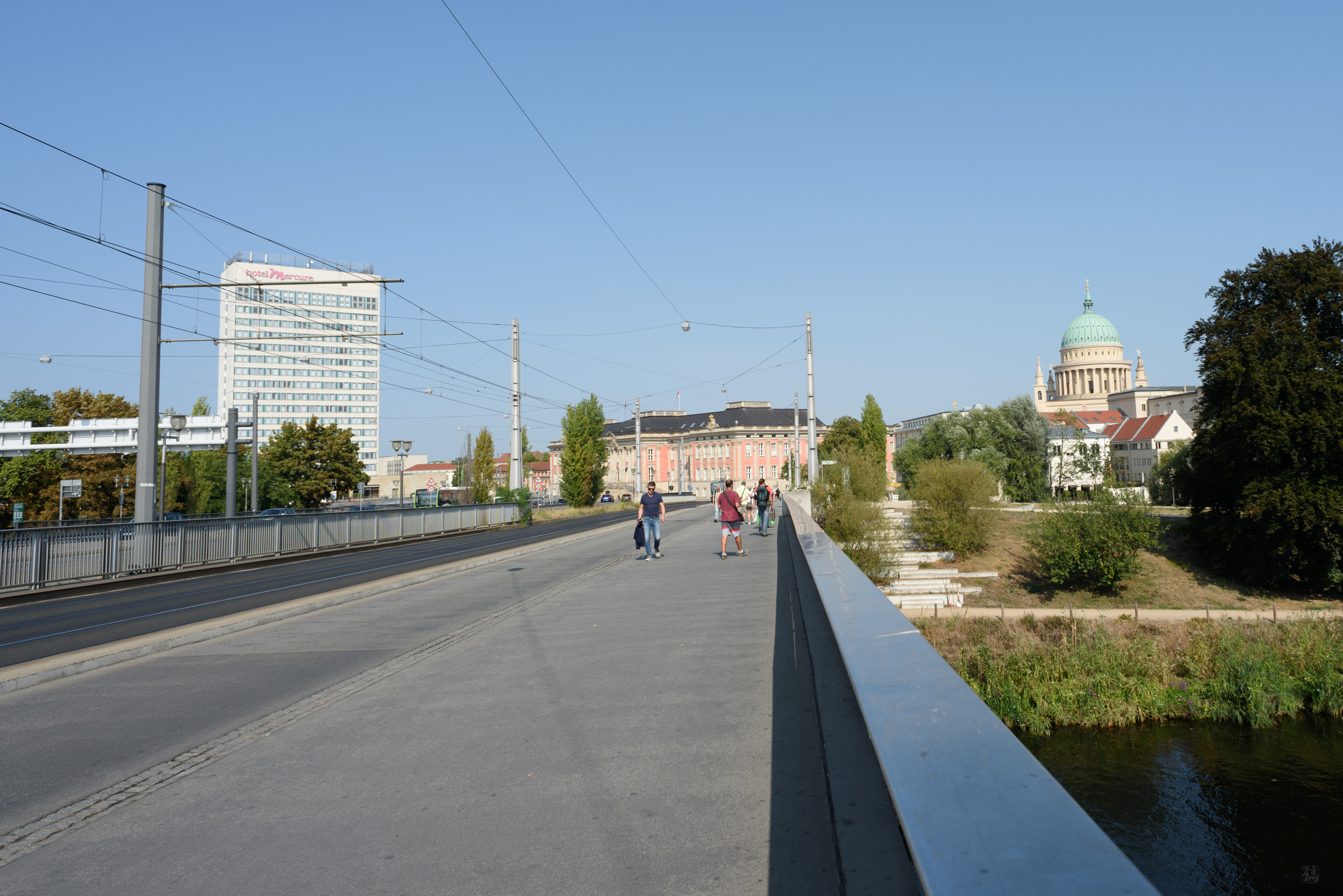 아무튼, 역에서 나오니 바로 앞에 다리가 있었고, 그 아래로 강이 흐르고 있었다. 그리고 다리 중간으로 트램이 지나가고 있었는데, 상수시 궁전으로 빨리 가려면 여기서 트램을 타거나 버스를 타는 게 정석이다. 그렇지만.. 아까 베를린에서 U반 1일권 권역을 AB만 끊는 바람에 트램을 타려면 별도 비요을 지불해야 했고(1일권 ABC 권역을 구매해야 한다), 그럴 바엔 도시 구경도 걷는 게 낫겠다 싶어 다리를 건너 뚜벅이로 걸어가기 시작했다.