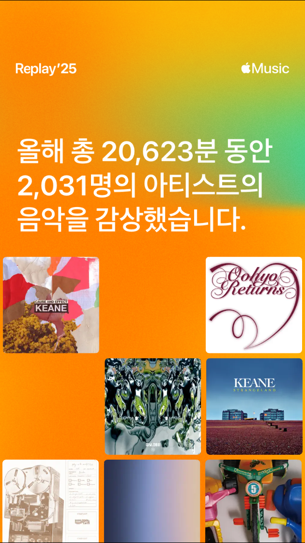 Apple Music 2025년 음악 결산 2025.12.15 17:30 Works/Music 반응형 올해도 어김없이 찾아온 애플뮤직 음악 결산. 나도 모르는 아티스트들이 많다. 플리 위주로 듣기 때문. 하우스 음악 플리들을 계속 반복재생하다 보니 ㅎㅎ... 그나마 국카스텐 신보가 유일한 예외라면 예외. 총체적으로, 2023년의 그 모습으로 돌아왔다고 한다. 일렉트로닉 음악 많이 찾아듣던 그 모습.. 이젠 플리마저 50기가 돌파 총 노래는 55기가 돌파 이제 네이버 VIBE MP3 다운도 막혔는데 하우스음악들 MP3 어디서 받아야하나...? 공유하기 게시글 관리 Echte Liebe 저작자표시 비영리 변경금지 (새창열림) 'Works > Music' 카테고리의 다른 글 <Youtubes> 요 최근 2~3년간 팍 꽂혔던 국내 아티스트들. (2) 2025.12.27 두고두고 아쉽다. (0) 2025.12.27 <Youtube> 소녀시대 - 다시 만난 세계 (0) 2025.12.03 <Youtube> 신해철 - 민물장어의 꿈 (0) 2025.10.27 <Album> 국카스텐 - Aurum (2) 2025.09.28 댓글 공유하기 다른 글 댓글 이 글 공유하기 구독하기 구독하기 카카오톡 카카오톡 라인 라인 트위터 트위터 Facebook Facebook 카카오스토리 카카오스토리 밴드 밴드 네이버 블로그 네이버 블로그 Pocket Pocket Evernote Evernote 다른 글 <Youtubes> 요 최근 2~3년간 팍 꽂혔던 국내 아티스트들. <Youtubes> 요 최근 2~3년간 팍 꽂혔던 국내 아티스트들. 2025.12.27 두고두고 아쉽다. 두고두고 아쉽다. 2025.12.27 <Youtube> 소녀시대 - 다시 만난 세계 <Youtube> 소녀시대 - 다시 만난 세계 2025.12.03 <Youtube> 신해철 - 민물장어의 꿈 <Youtube> 신해철 - 민물장어의 꿈 2025.10.27 다른 글 더 둘러보기
