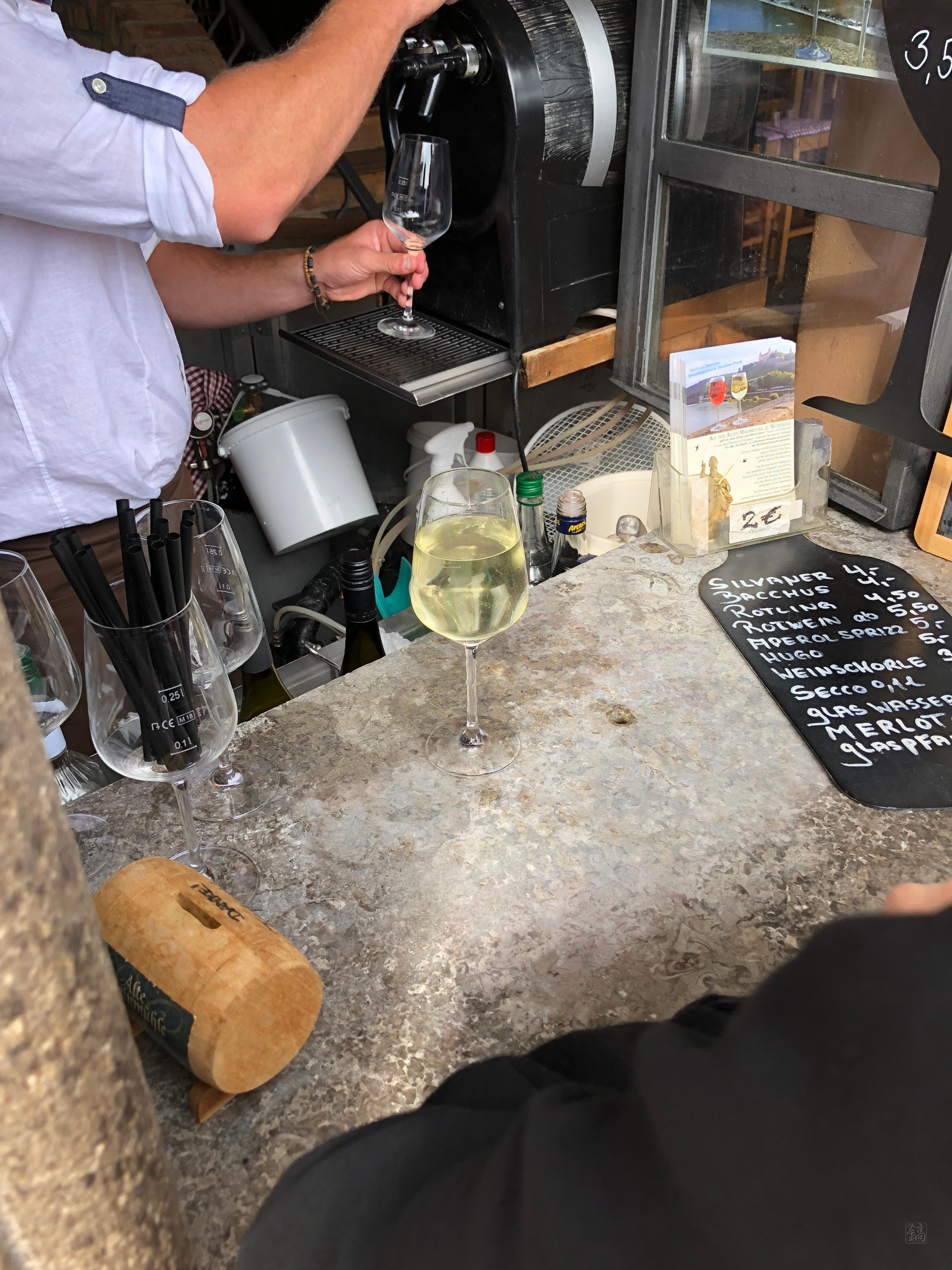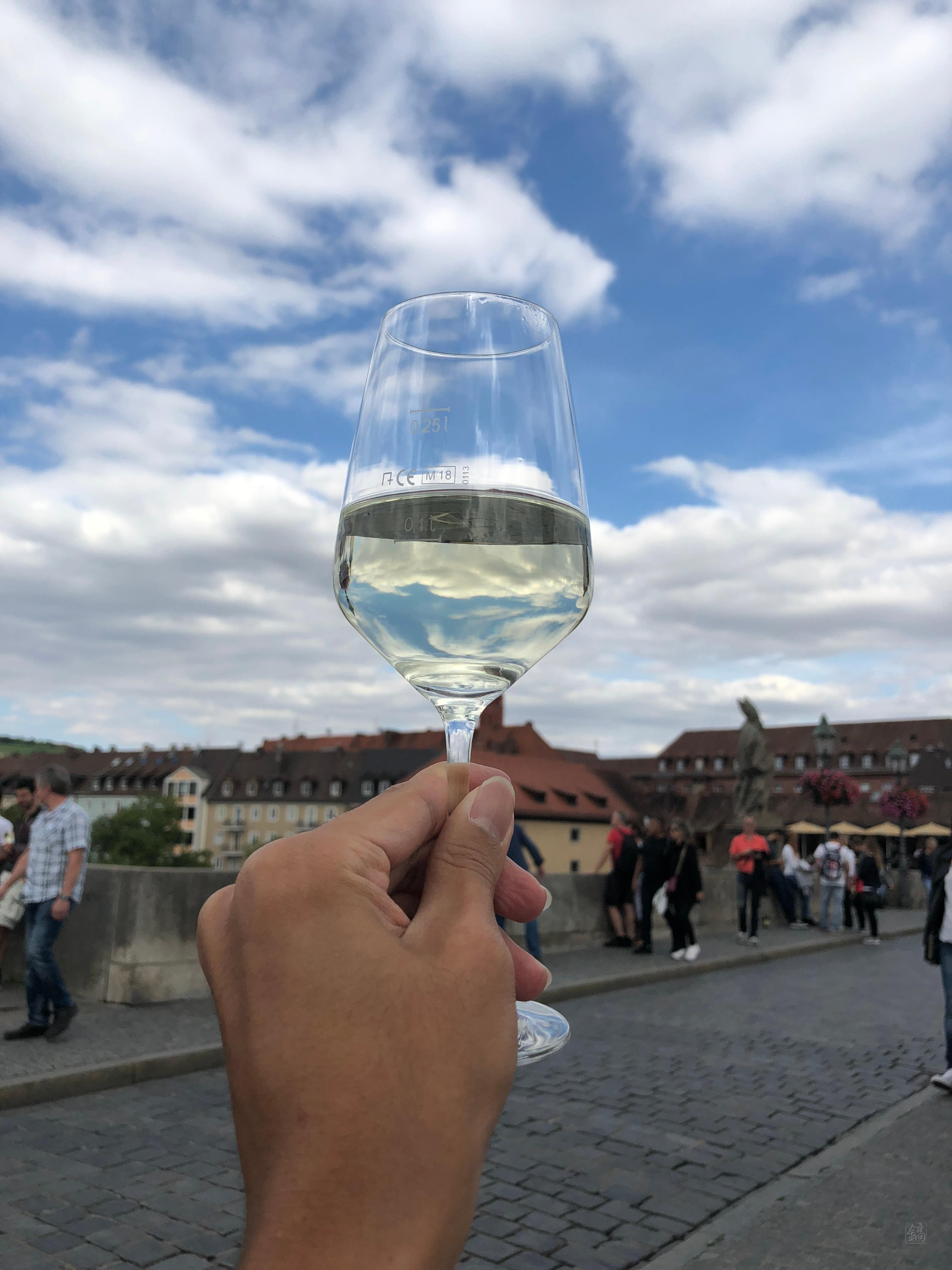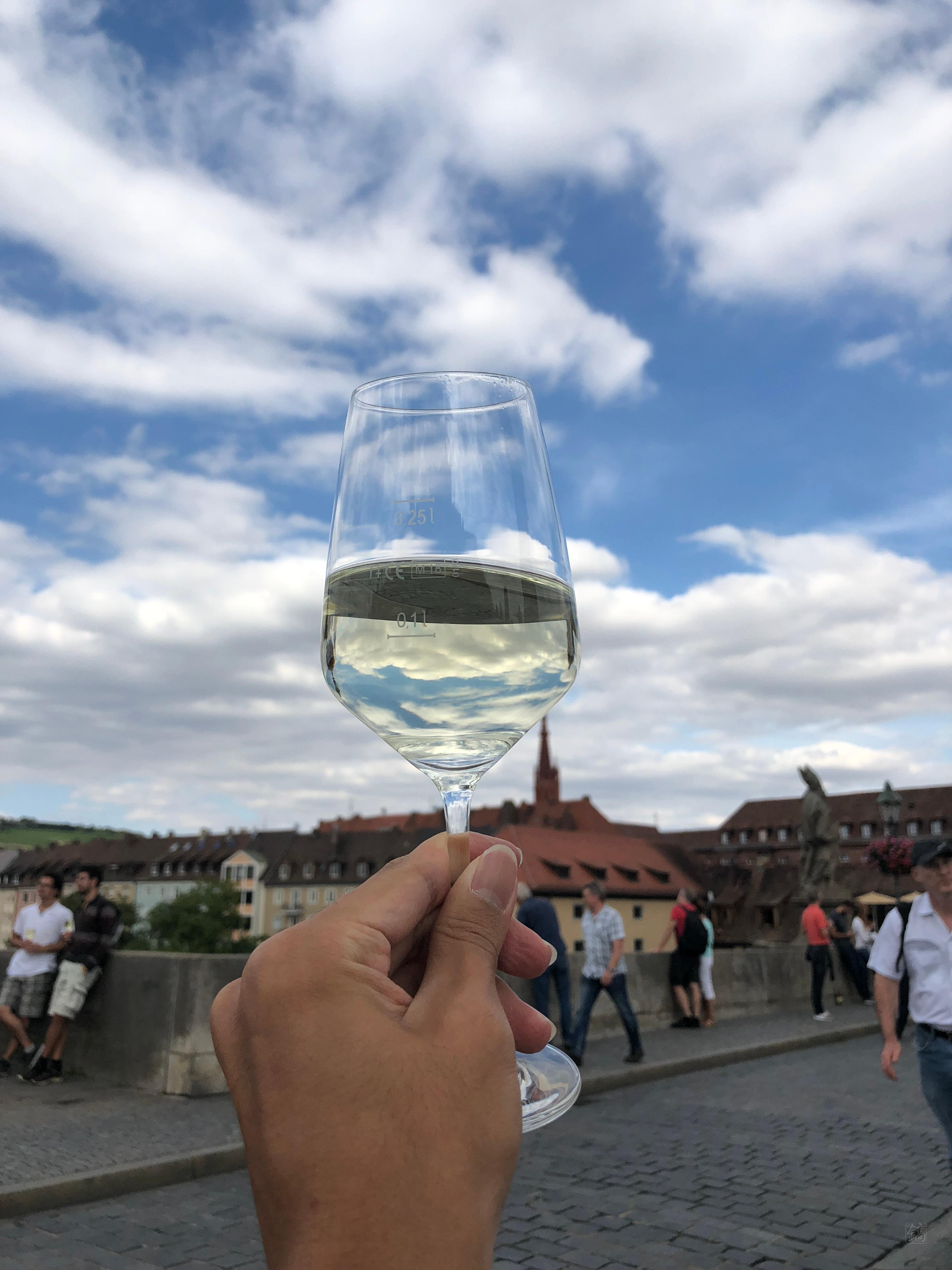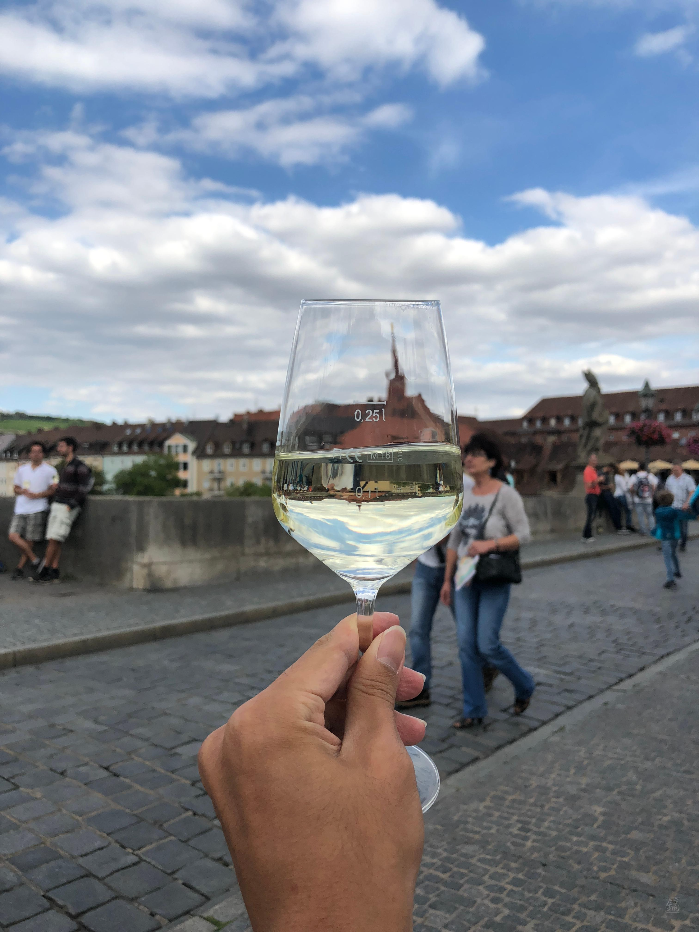 나중에 내려와서 다시 보니, 시내 측 다리 입구에서 화이트와인 잔술을 파는데, 가격도 저렴한데다 뷔르츠부르크 특산품이라 유명한 거였더라. 다들 와인 한 잔 하려고 줄 서서 기다리는 거였음.. 당시만 해도 와인을 그닥 좋아하지 않았던 터라 그냥 지나칠까 하다 이것도 추억이겠거니 하며 줄 서서 한 잔 샀다. 그리고..