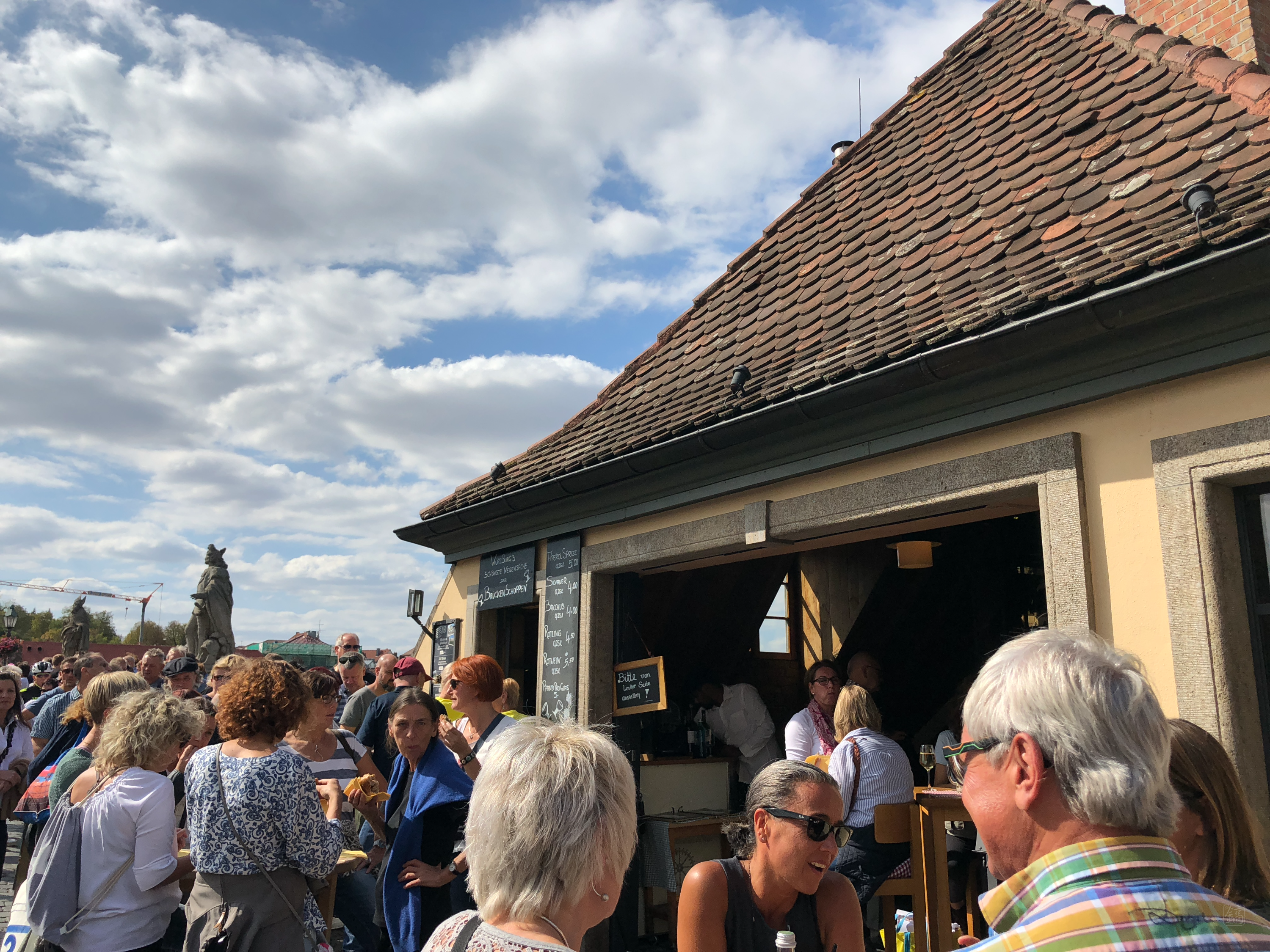 나중에 내려와서 다시 보니, 시내 측 다리 입구에서 화이트와인 잔술을 파는데, 가격도 저렴한데다 뷔르츠부르크 특산품이라 유명한 거였더라. 다들 와인 한 잔 하려고 줄 서서 기다리는 거였음.. 당시만 해도 와인을 그닥 좋아하지 않았던 터라 그냥 지나칠까 하다 이것도 추억이겠거니 하며 줄 서서 한 잔 샀다. 그리고..