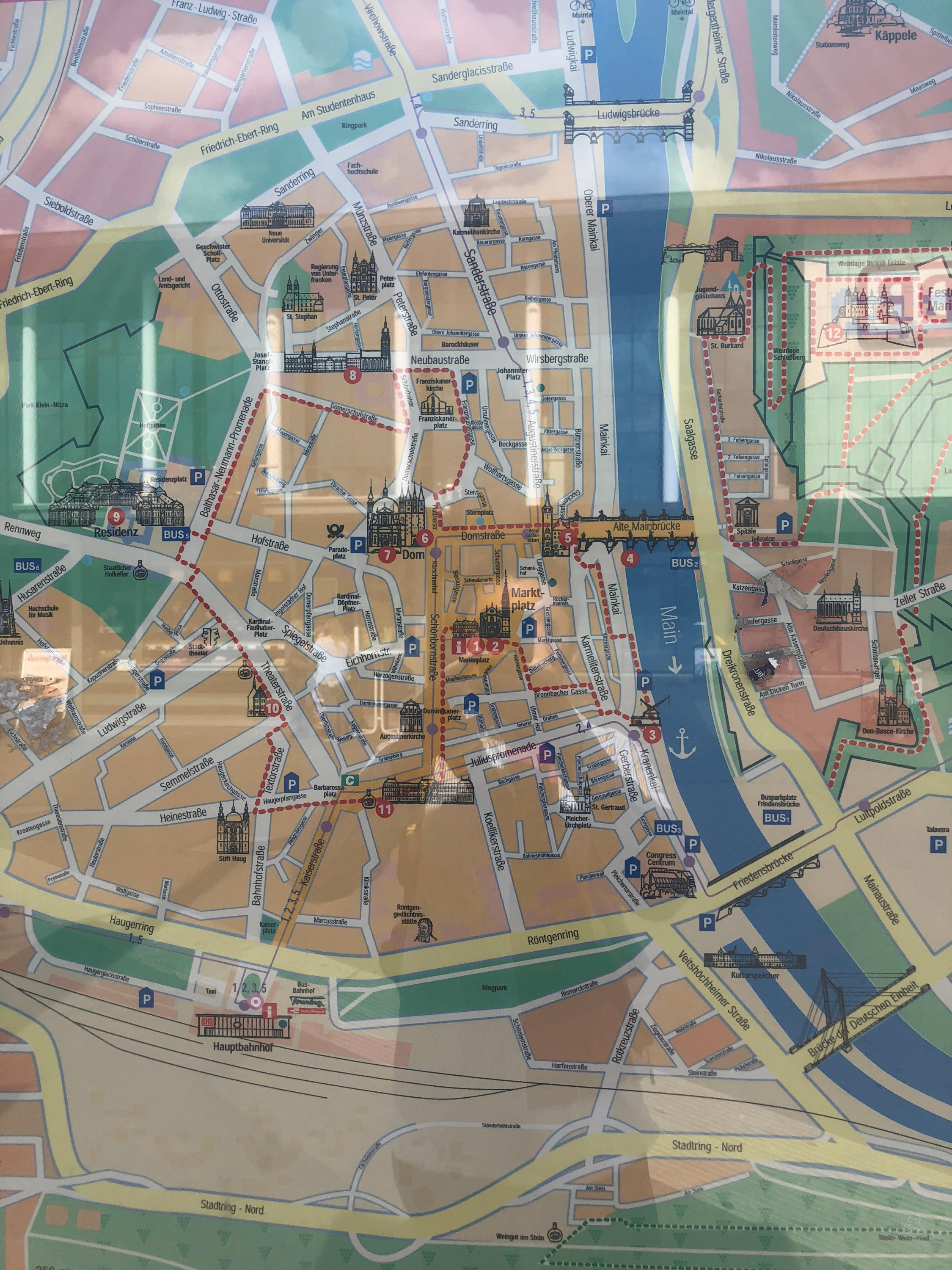 뷔르츠부르크 중앙역에 후다닥 내리자마자 물품보관함을 찾아 배낭을 넣어두고, 요새로 가는 교통편부터 찾아봤다. 아직까지 몸 컨디션이 완전히 돌아온 게 아니라 되도록이면 체력을 아끼고 싶었기 때문이다. 하지만 노선표를 봐도 이해가 안되는 걸 어쩌나... 어쩔 수 없이 그냥 오는대로 탔고, 시내에서 정차했다. 알고보니 거기가 시청 주변이었고, 다리 하나 건너면 바로 요새 시작이더라.