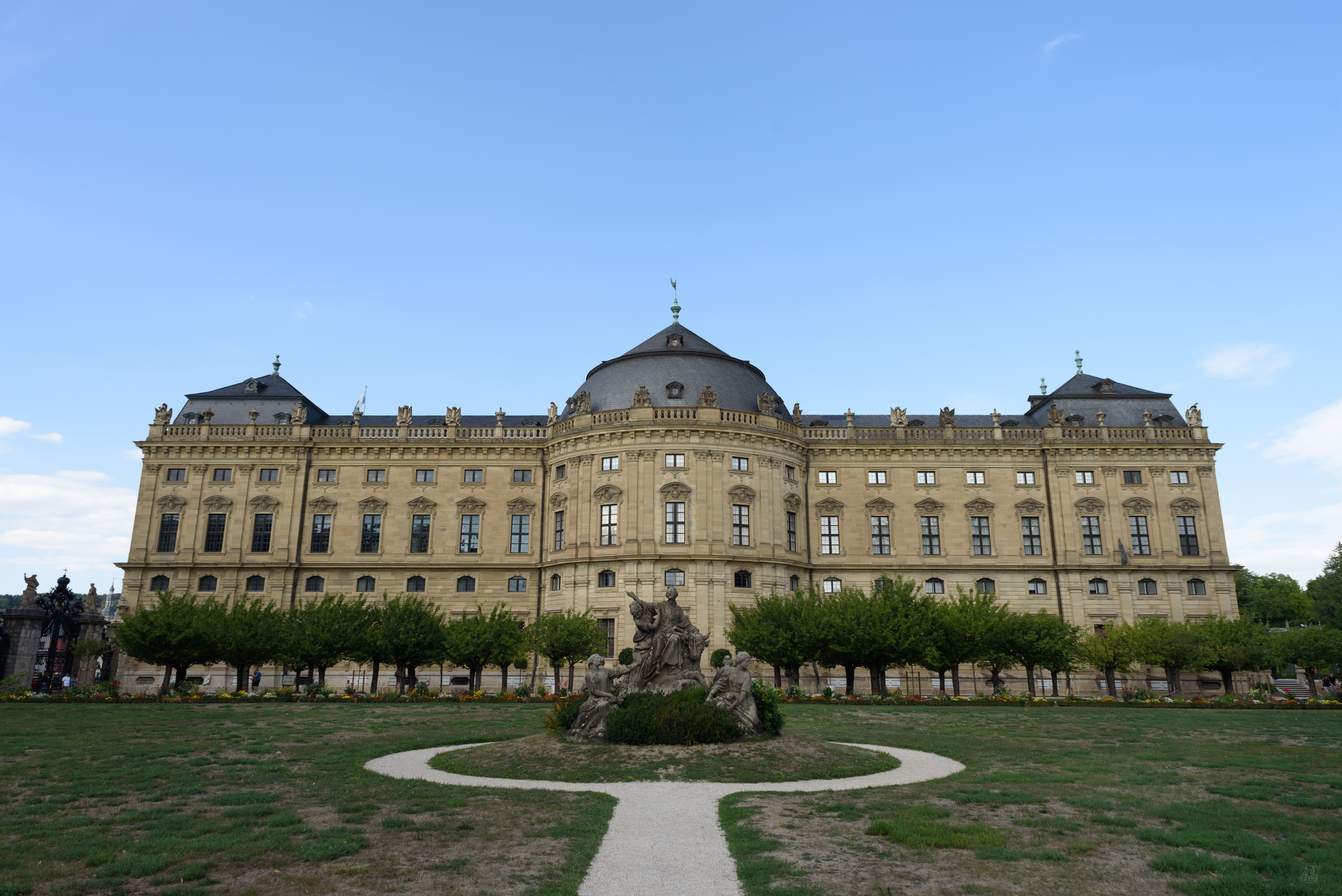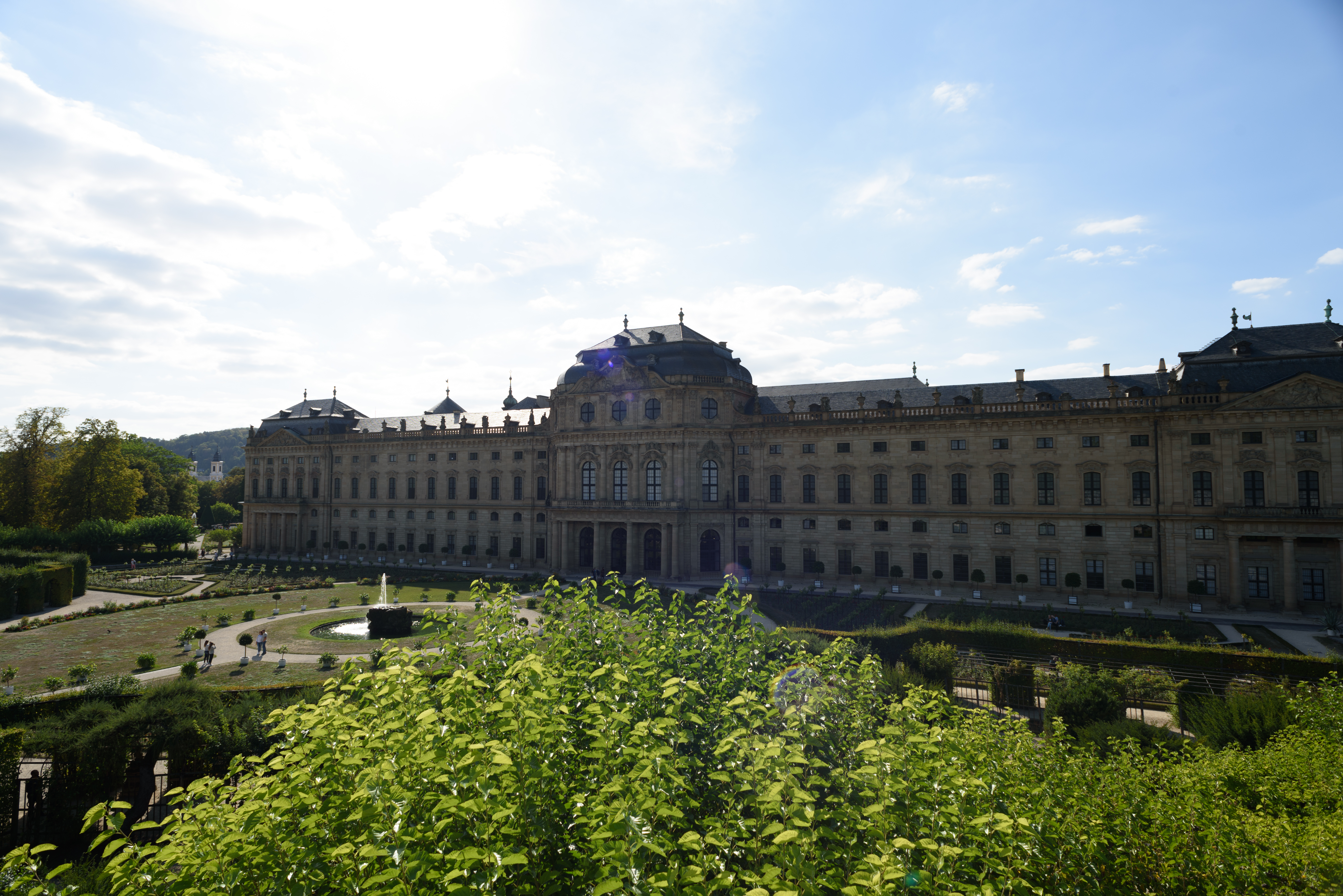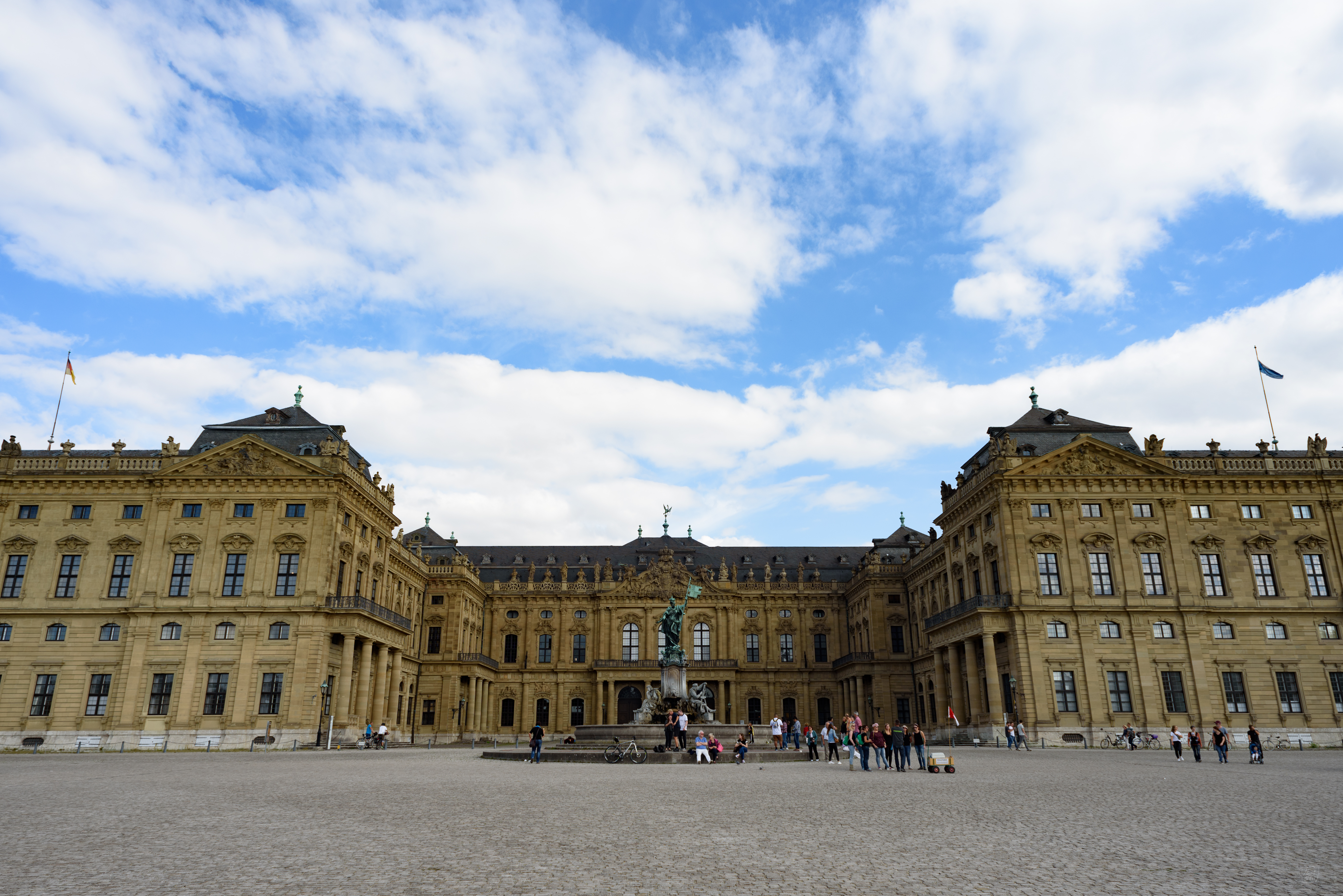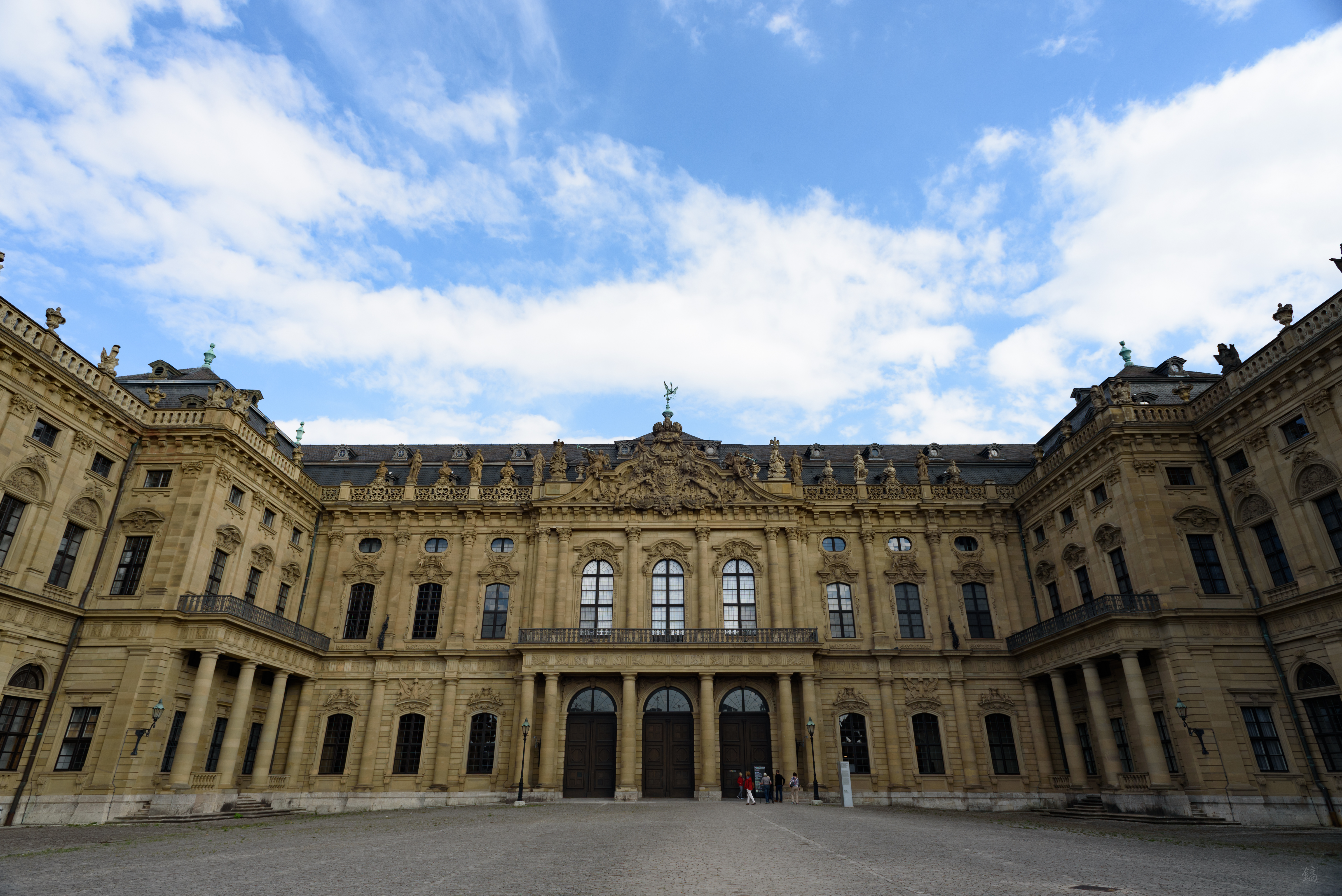 그리고 천천히 걸어 약 30분 정도 걸어(중간에 길을 좀 헤매기도 했다. 구글 맵 따라 제대로 가면 12분이면 가는 거리임.) 뷔르츠부르크 궁전에 도착했다. 건축 양식을 자세히 아는 건 아니지만, 지금까지 봤던 동쪽 지방의 궁전들(상수시 궁전, 샤를로텐부르크 궁전, 그리고 츠빙어 궁전)과는 겉보기에도 사뭇 달라보였다. 그렇지만 파란 하늘 덕에 예쁜 건 확실히 알았으니(?)