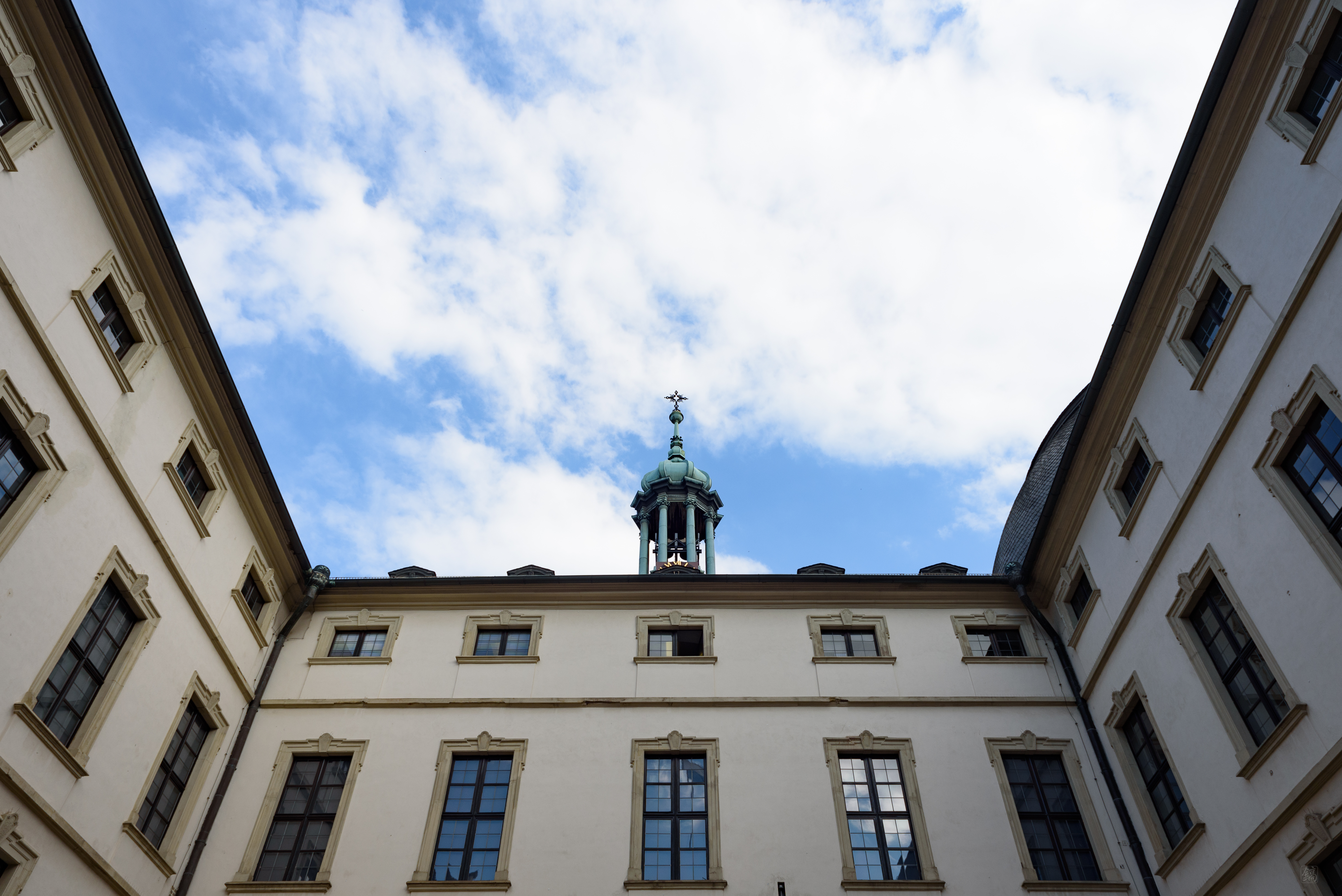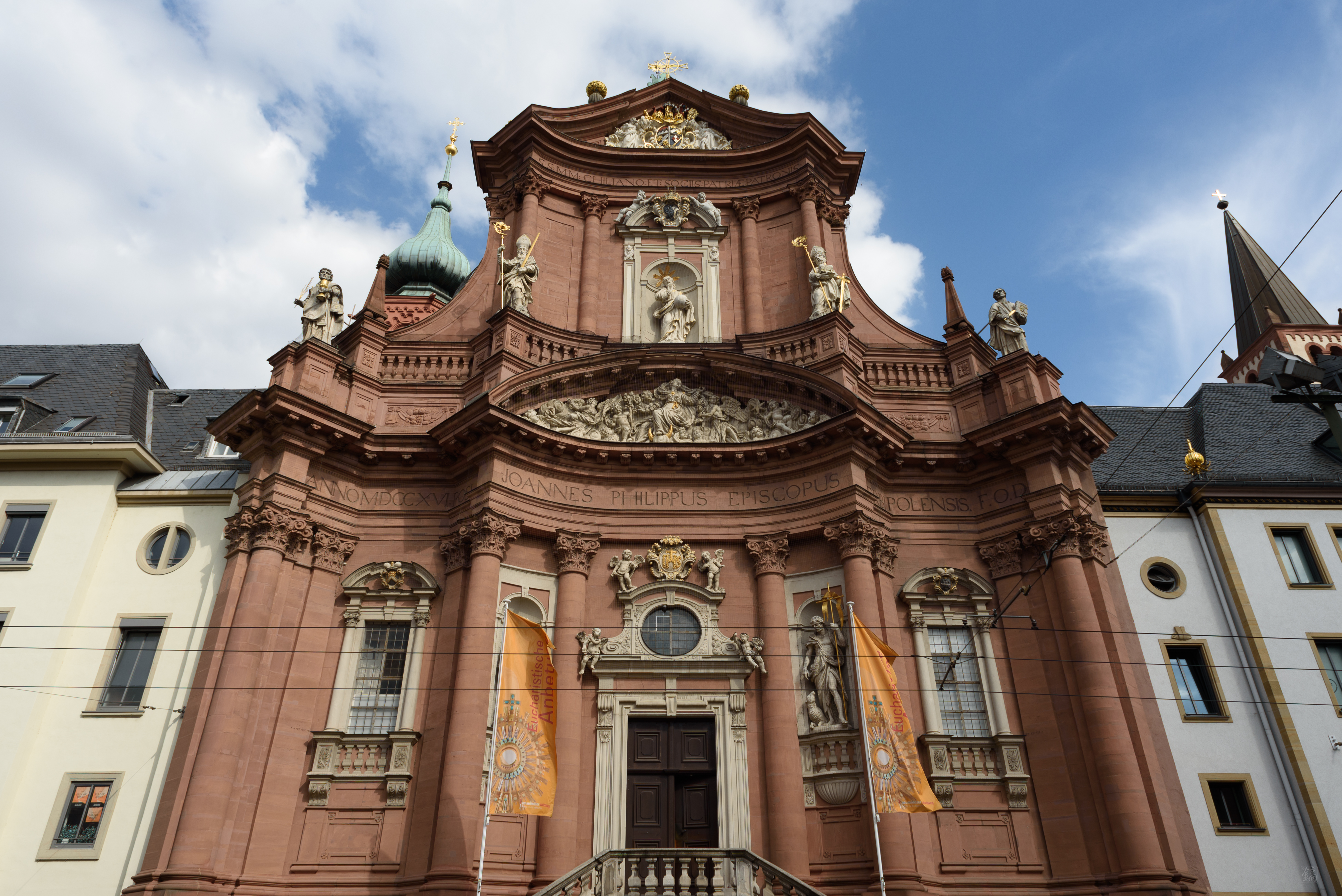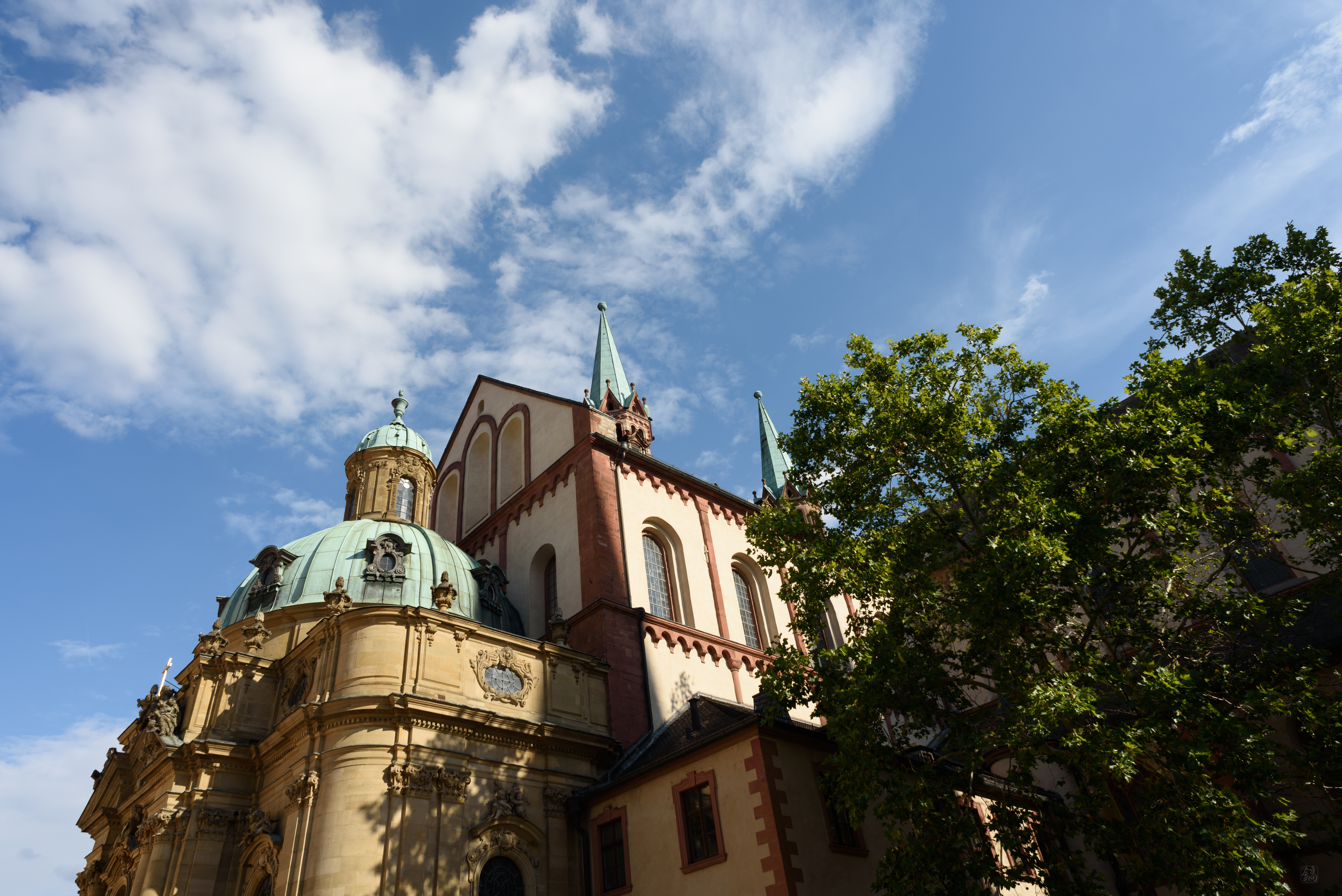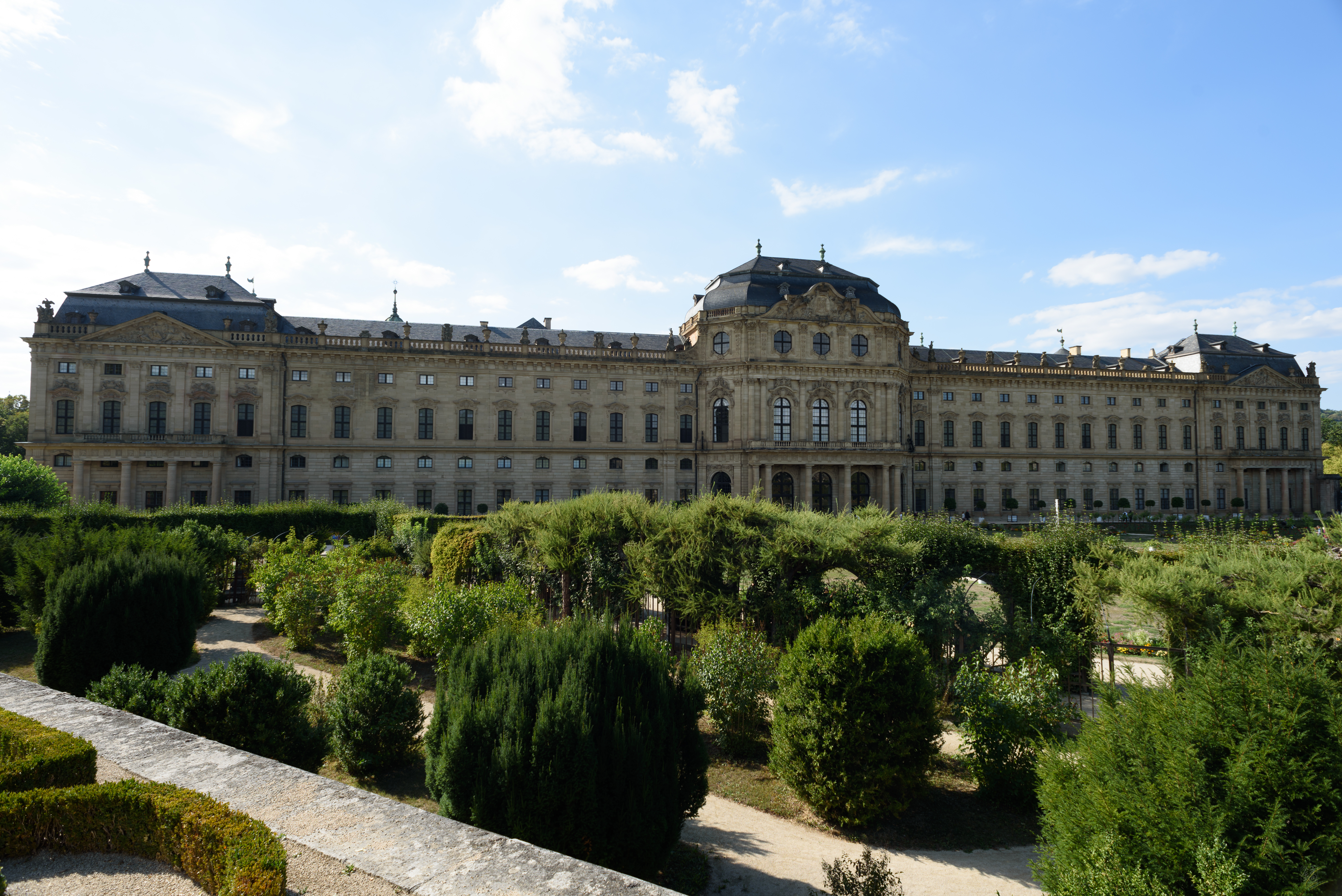 그리고 천천히 걸어 약 30분 정도 걸어(중간에 길을 좀 헤매기도 했다. 구글 맵 따라 제대로 가면 12분이면 가는 거리임.) 뷔르츠부르크 궁전에 도착했다. 건축 양식을 자세히 아는 건 아니지만, 지금까지 봤던 동쪽 지방의 궁전들(상수시 궁전, 샤를로텐부르크 궁전, 그리고 츠빙어 궁전)과는 겉보기에도 사뭇 달라보였다. 그렇지만 파란 하늘 덕에 예쁜 건 확실히 알았으니(?)